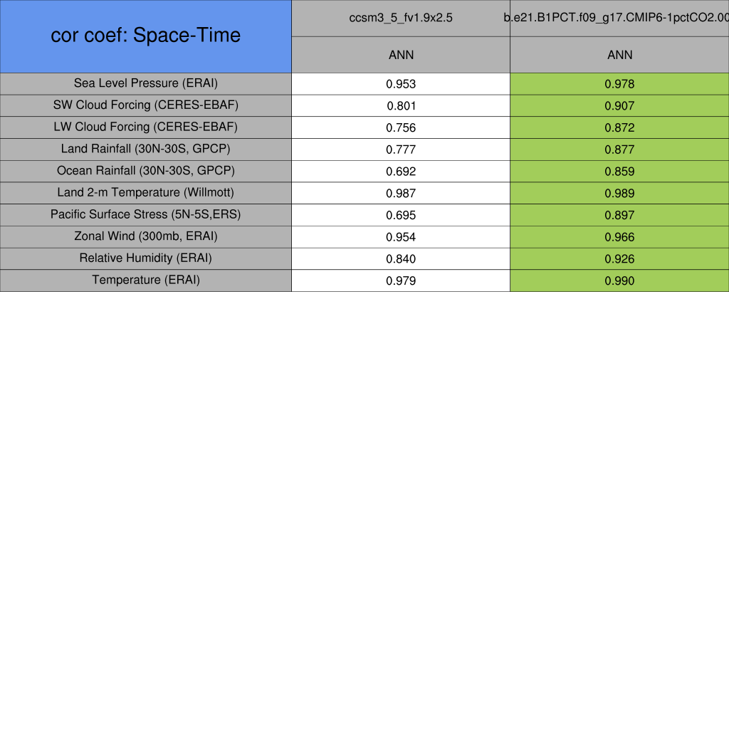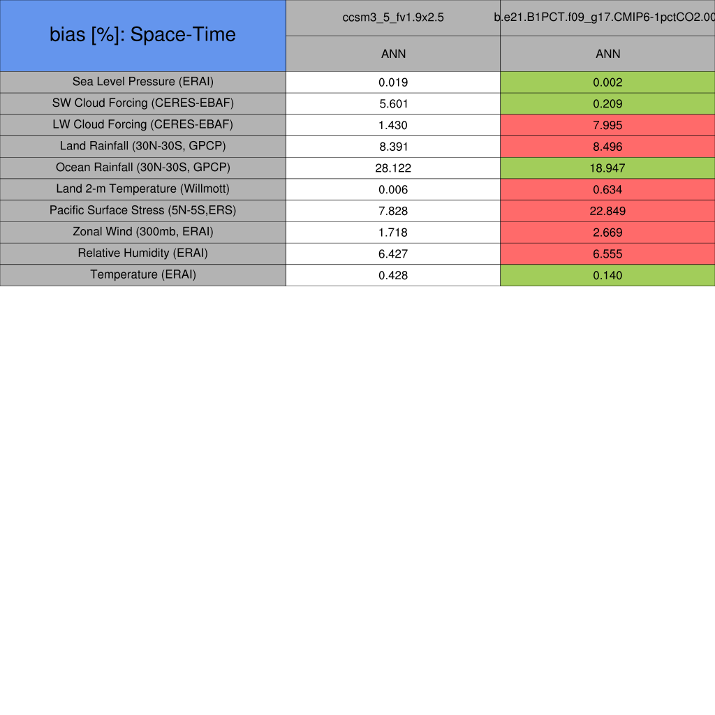 Taylor Diagrams were developed by Karl Taylor at PCMDI (paper|tech note) and aim to condense information about variance and RMSE characteristics of a particular model run when compared with observations in a single diagram. The tables summarize the individual metrics for each variable considered including: