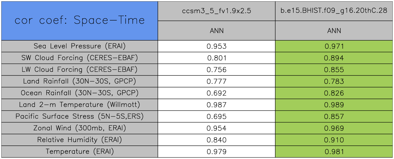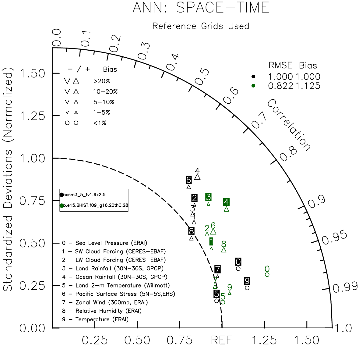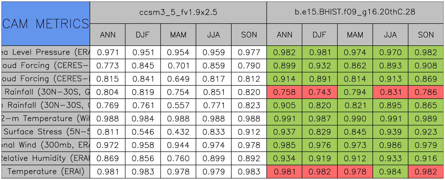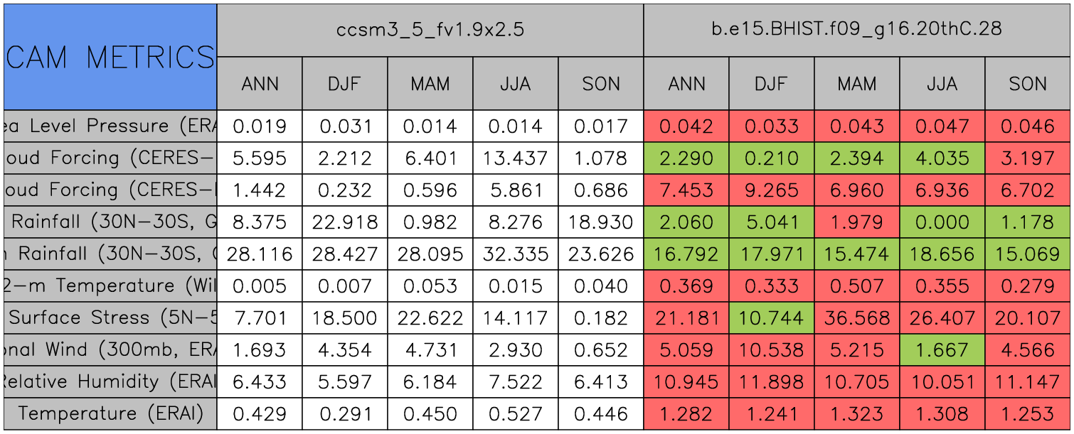 Taylor Diagrams were developed by Karl Taylor at PCMDI (paper|tech note) and aim to condense information about variance and RMSE characteristics of a particular model run when compared with observations in a single diagram. The tables summarize the individual metrics for each variable considered including: