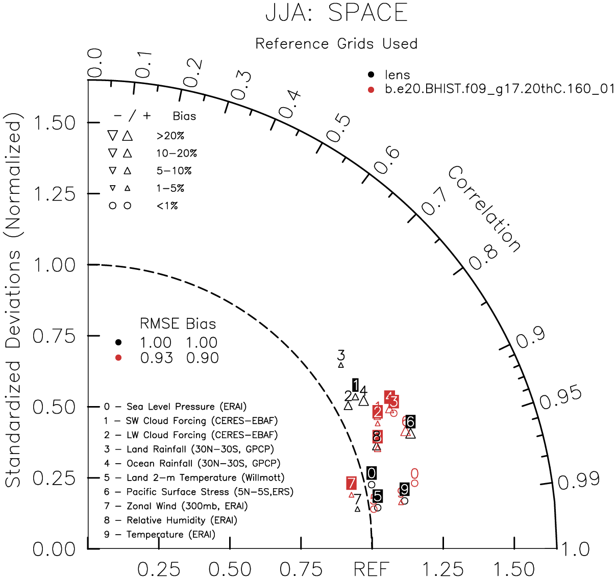 Taylor Diagrams were developed by Karl Taylor at PCMDI (paper|tech note) and aim to condense information about variance and RMSE characteristics of a particular model run when compared with observations in a single diagram. The tables summarize the individual metrics for each variable considered including: