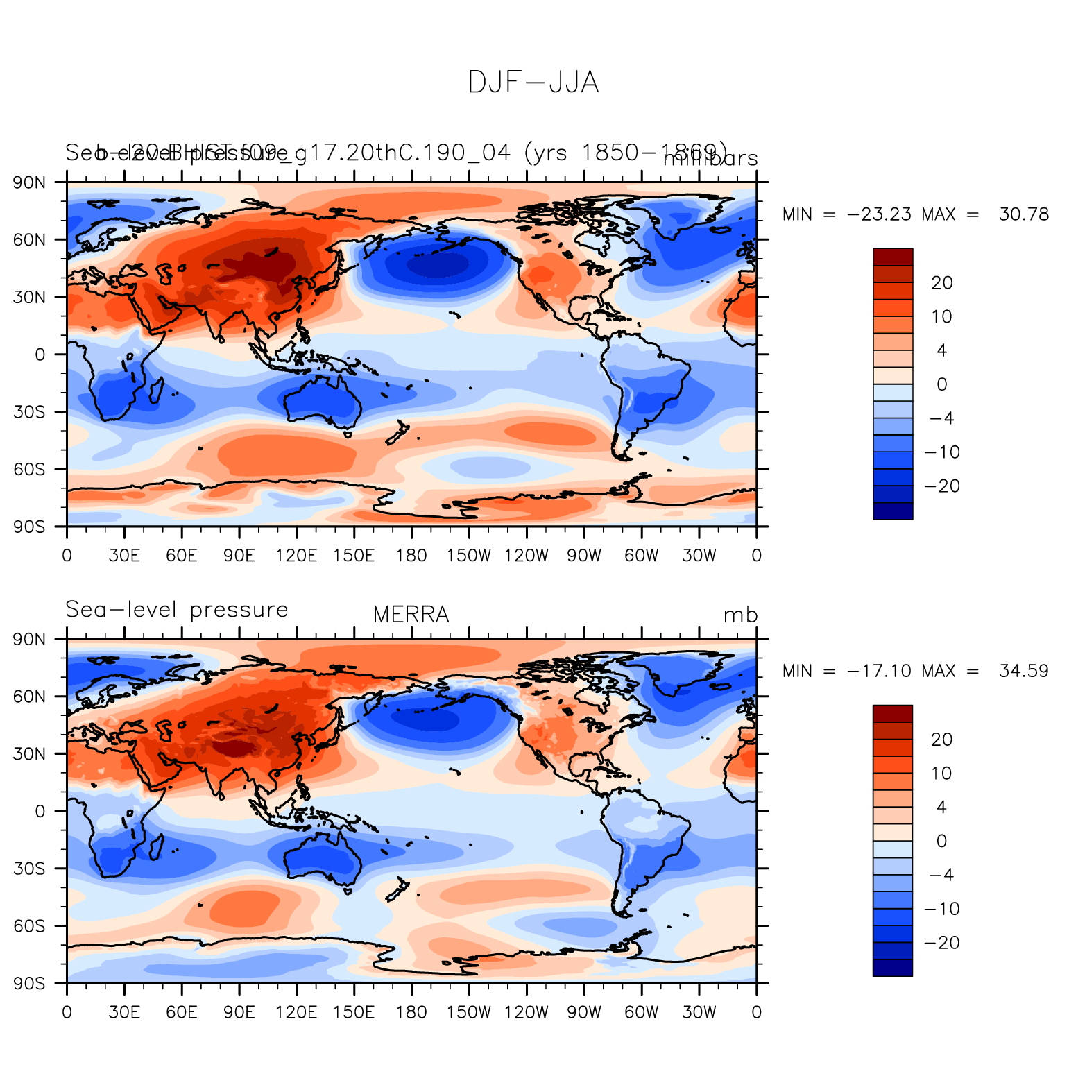 b.e20.BHIST.f09_g17.20thC.190_04 DIAG Set 9 - Horizontal contour plots of DJF-JJA differences