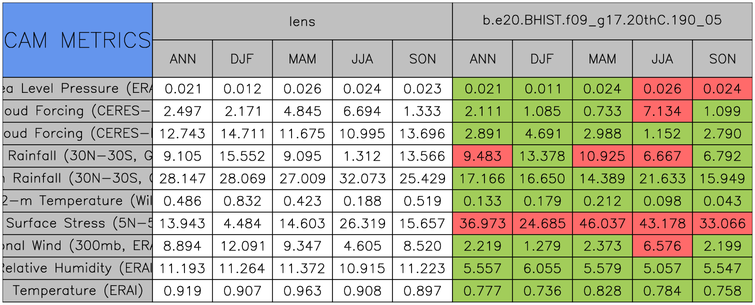 Taylor Diagrams were developed by Karl Taylor at PCMDI (paper|tech note) and aim to condense information about variance and RMSE characteristics of a particular model run when compared with observations in a single diagram. The tables summarize the individual metrics for each variable considered including: