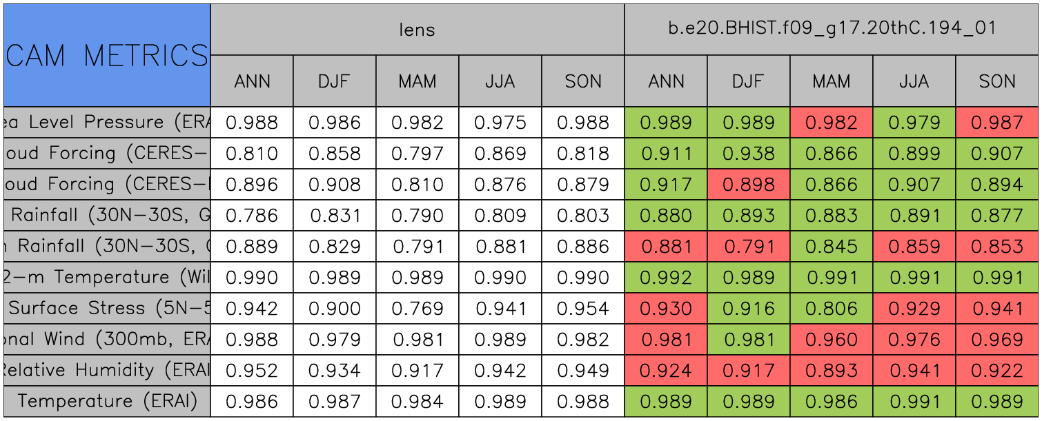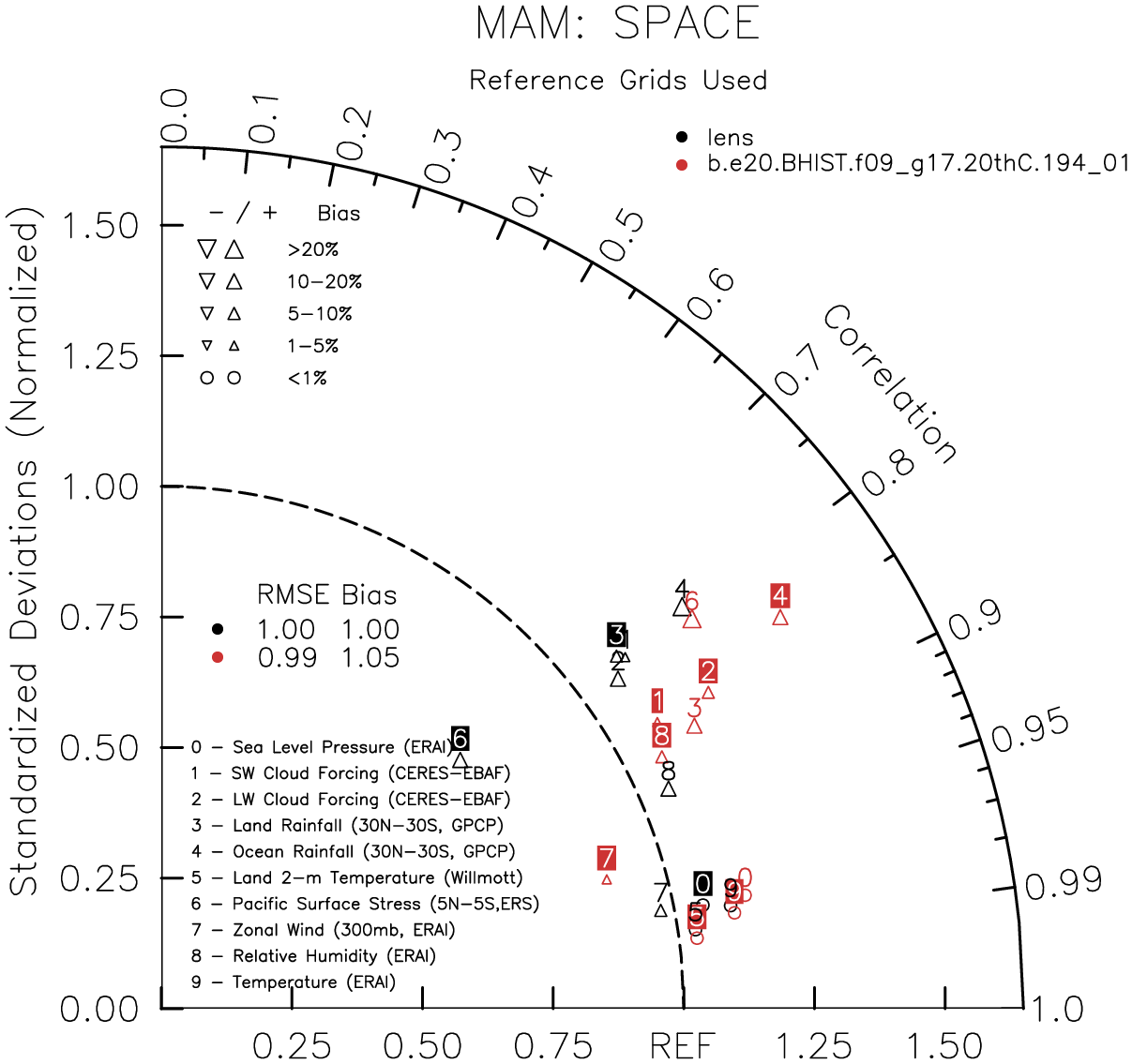 Taylor Diagrams were developed by Karl Taylor at PCMDI (paper|tech note) and aim to condense information about variance and RMSE characteristics of a particular model run when compared with observations in a single diagram. The tables summarize the individual metrics for each variable considered including: