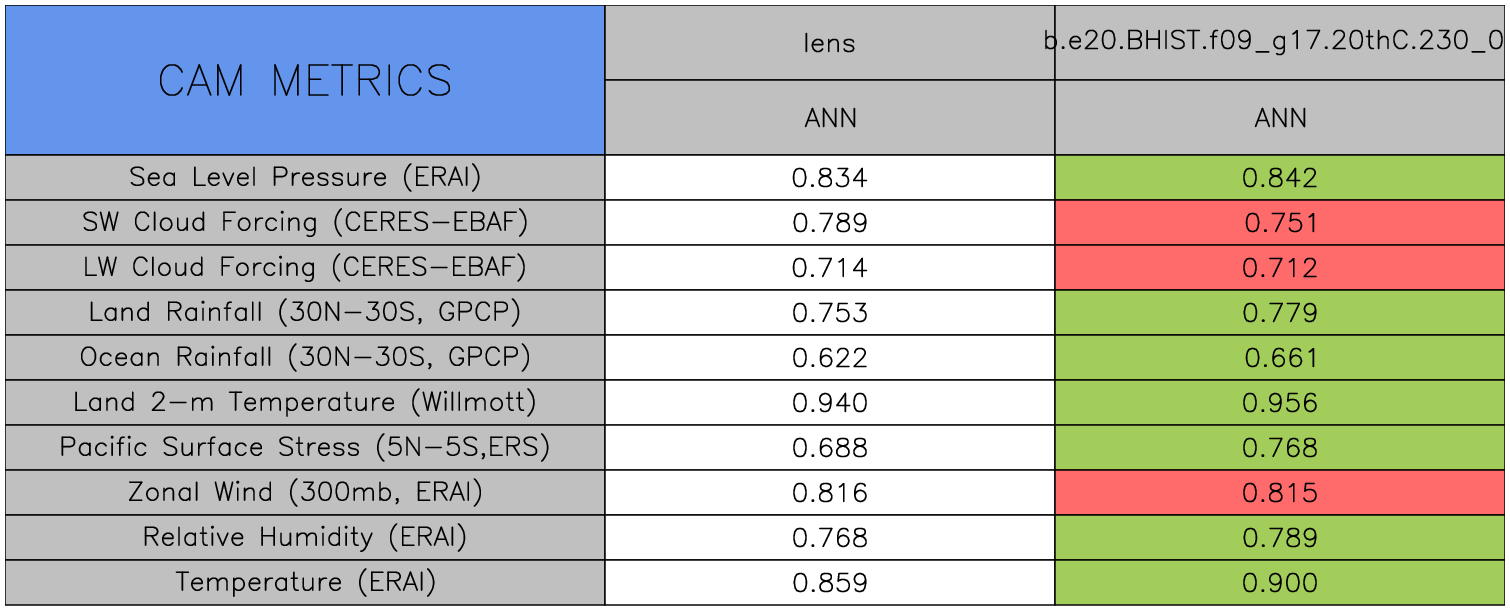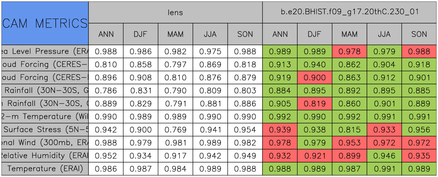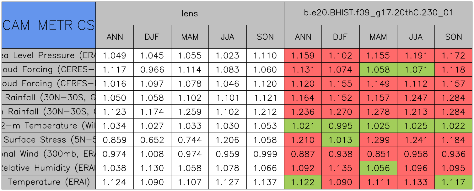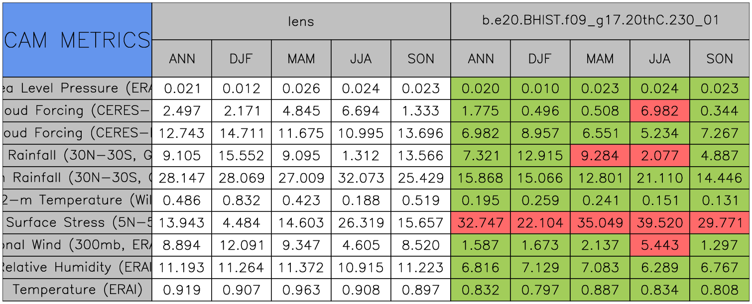 Taylor Diagrams were developed by Karl Taylor at PCMDI (paper|tech note) and aim to condense information about variance and RMSE characteristics of a particular model run when compared with observations in a single diagram. The tables summarize the individual metrics for each variable considered including: