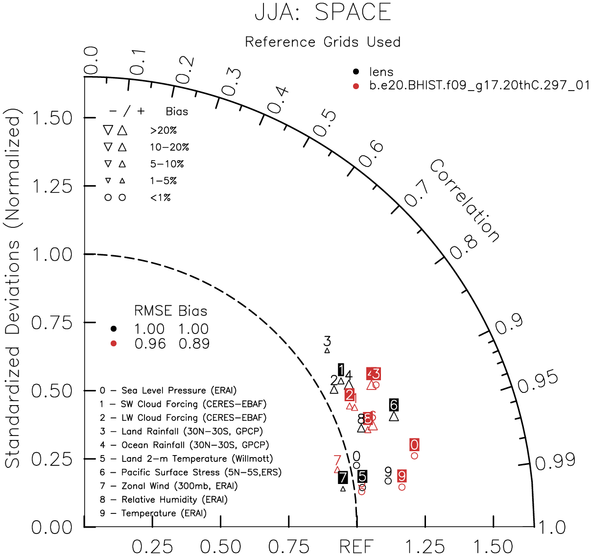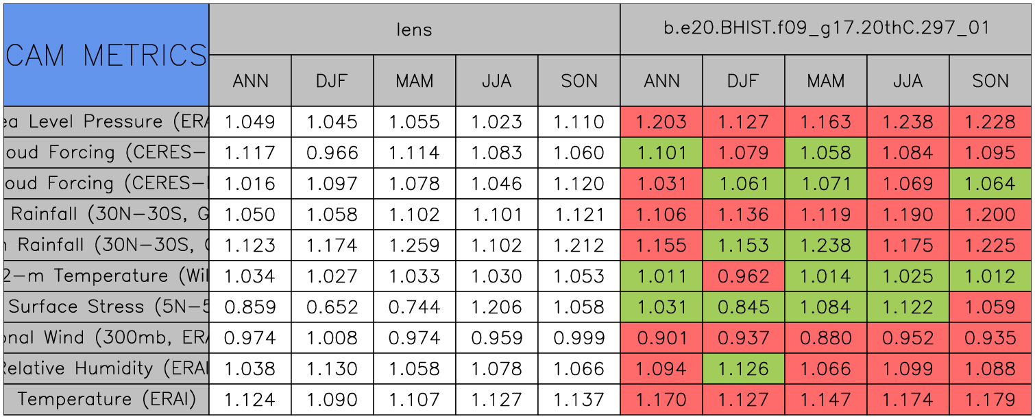 Taylor Diagrams were developed by Karl Taylor at PCMDI (paper|tech note) and aim to condense information about variance and RMSE characteristics of a particular model run when compared with observations in a single diagram. The tables summarize the individual metrics for each variable considered including: