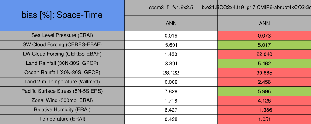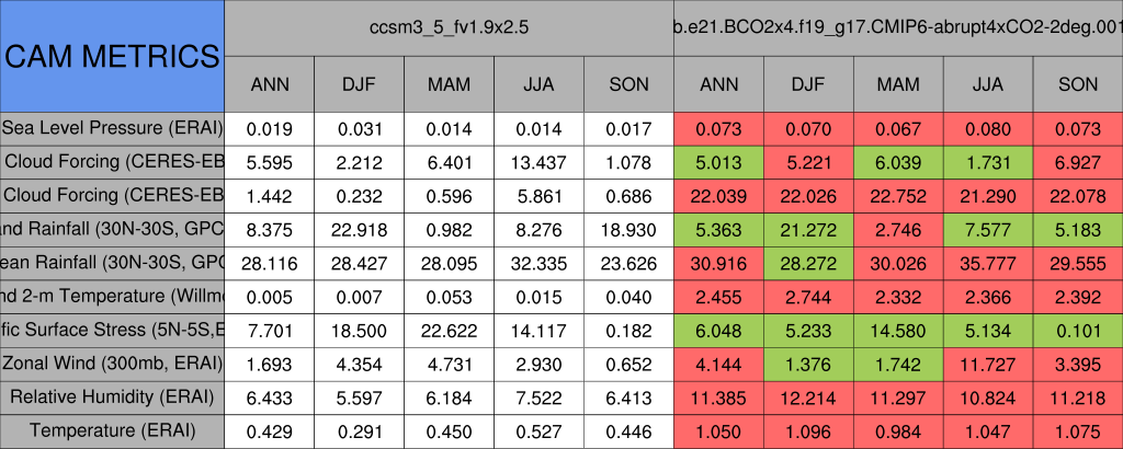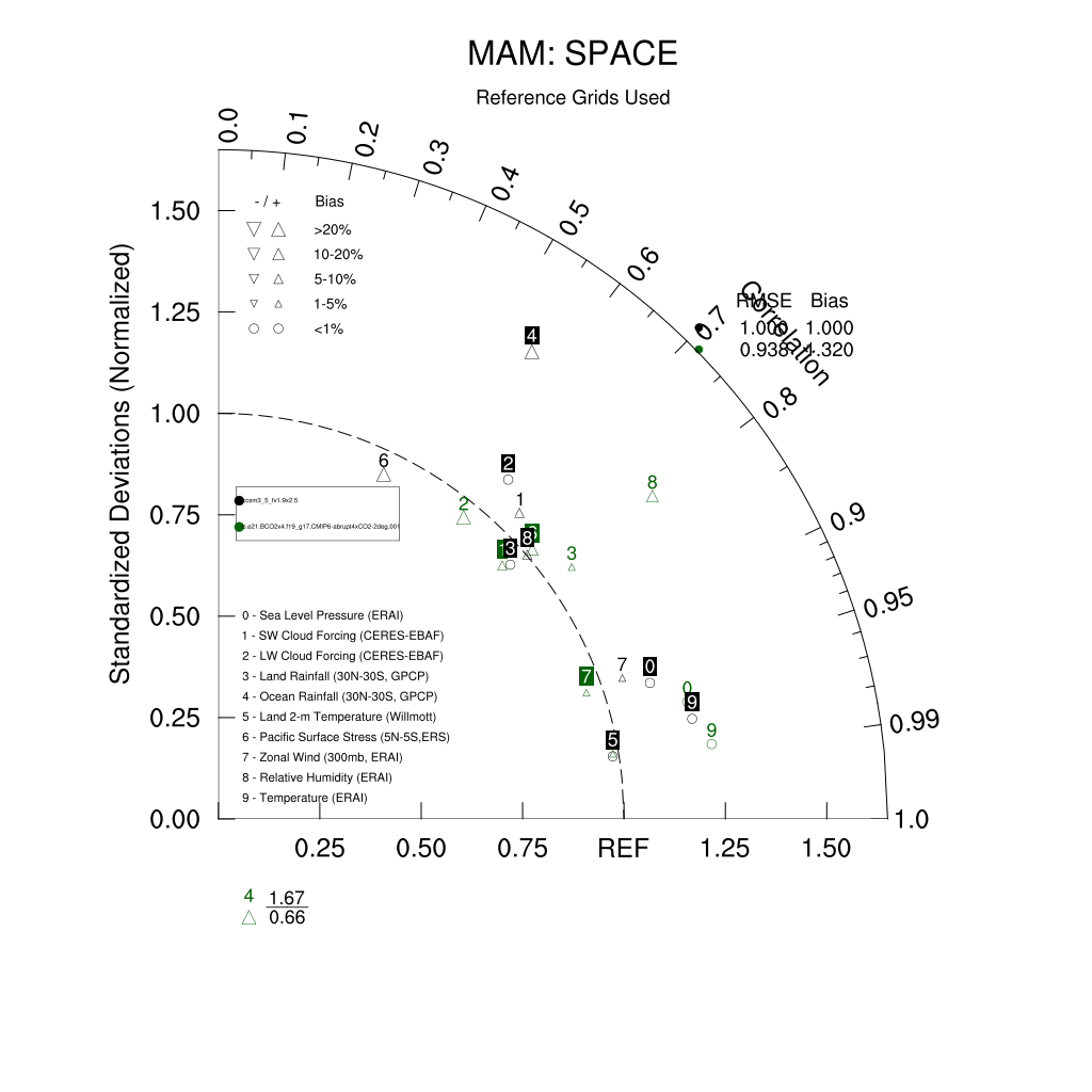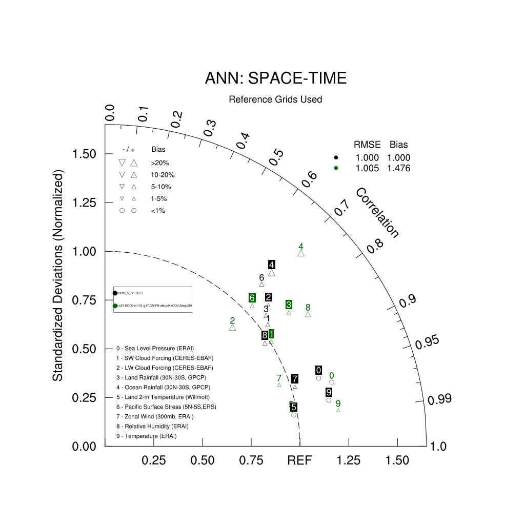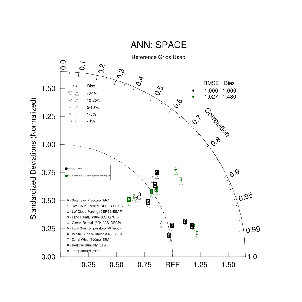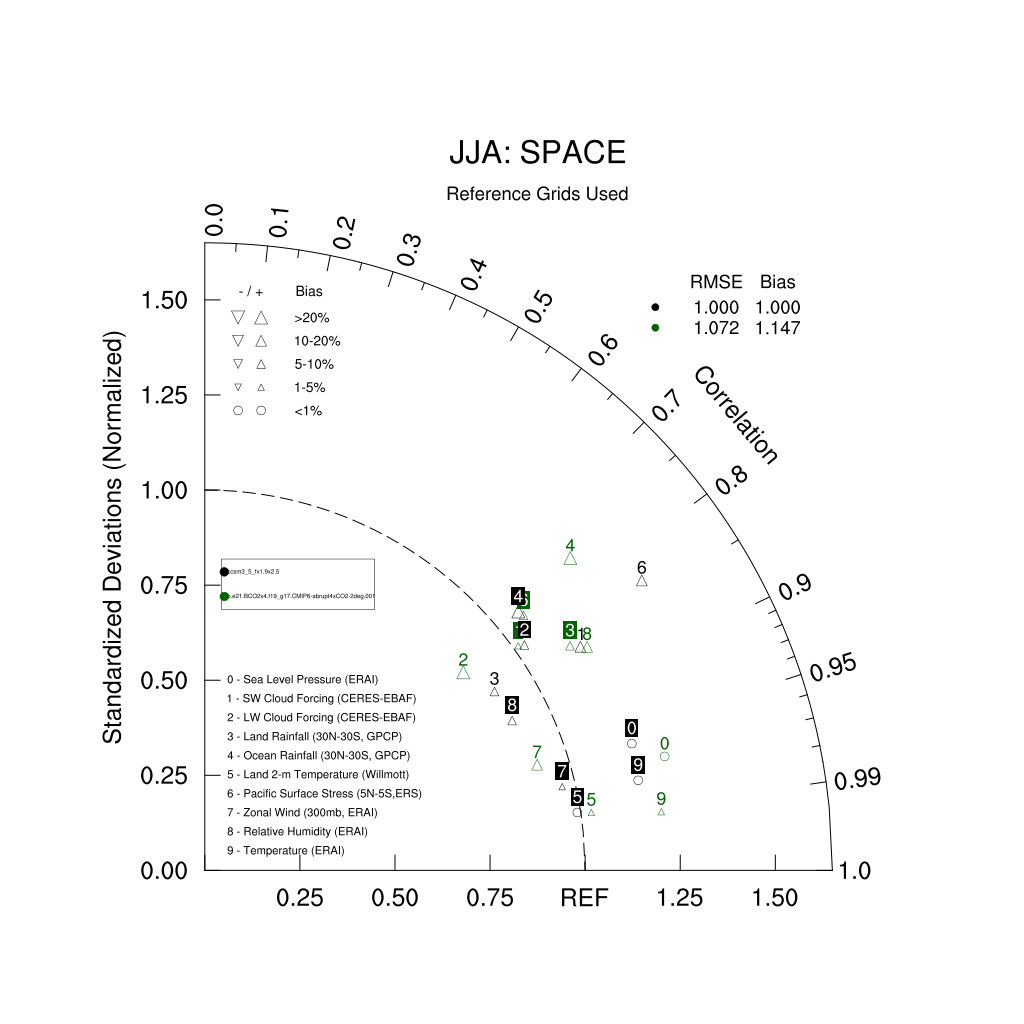 Taylor Diagrams were developed by Karl Taylor at PCMDI (paper|tech note) and aim to condense information about variance and RMSE characteristics of a particular model run when compared with observations in a single diagram. The tables summarize the individual metrics for each variable considered including: