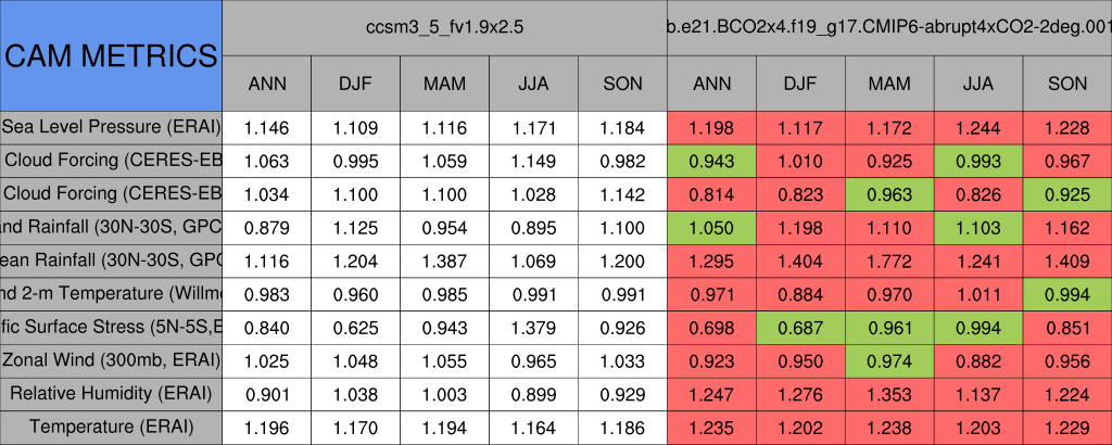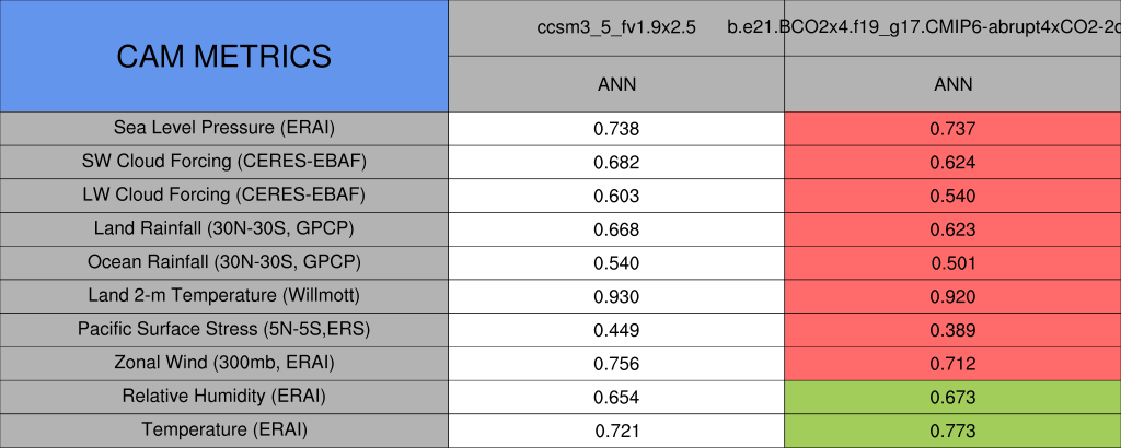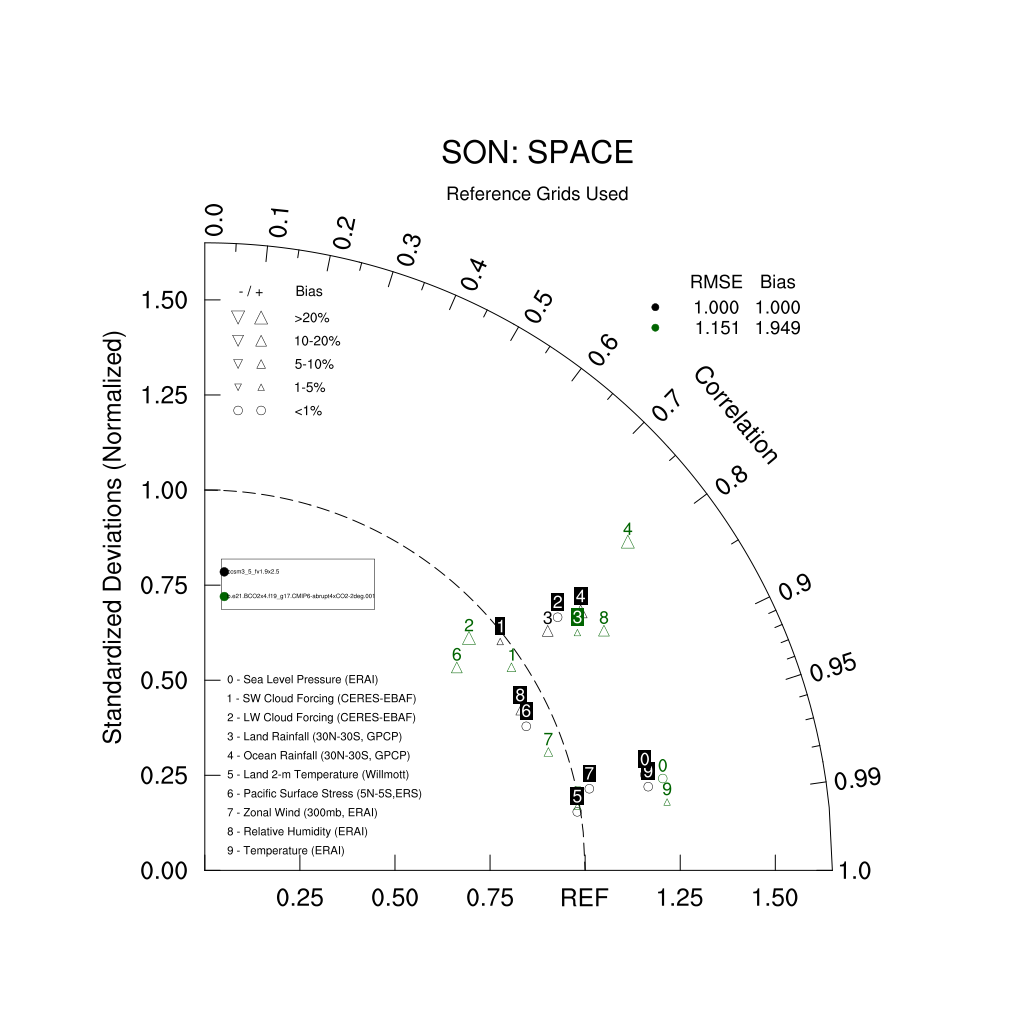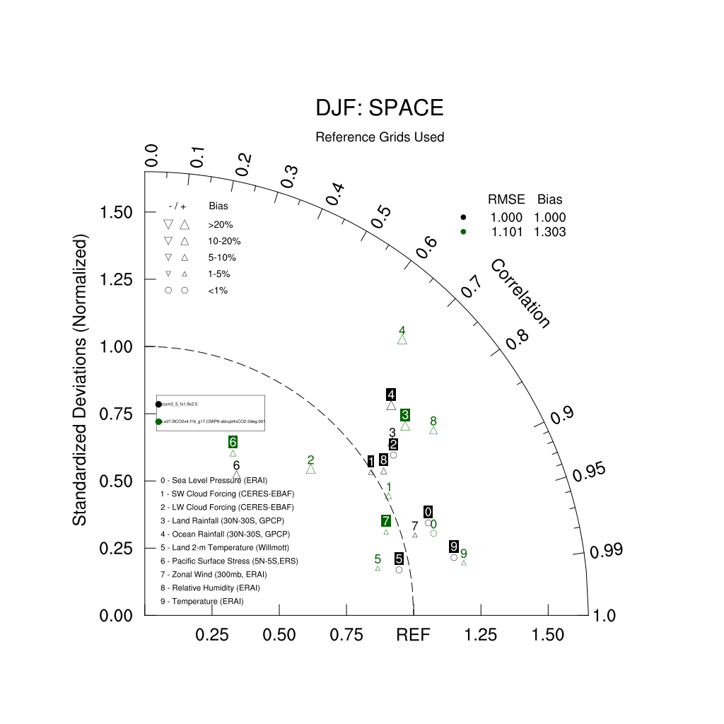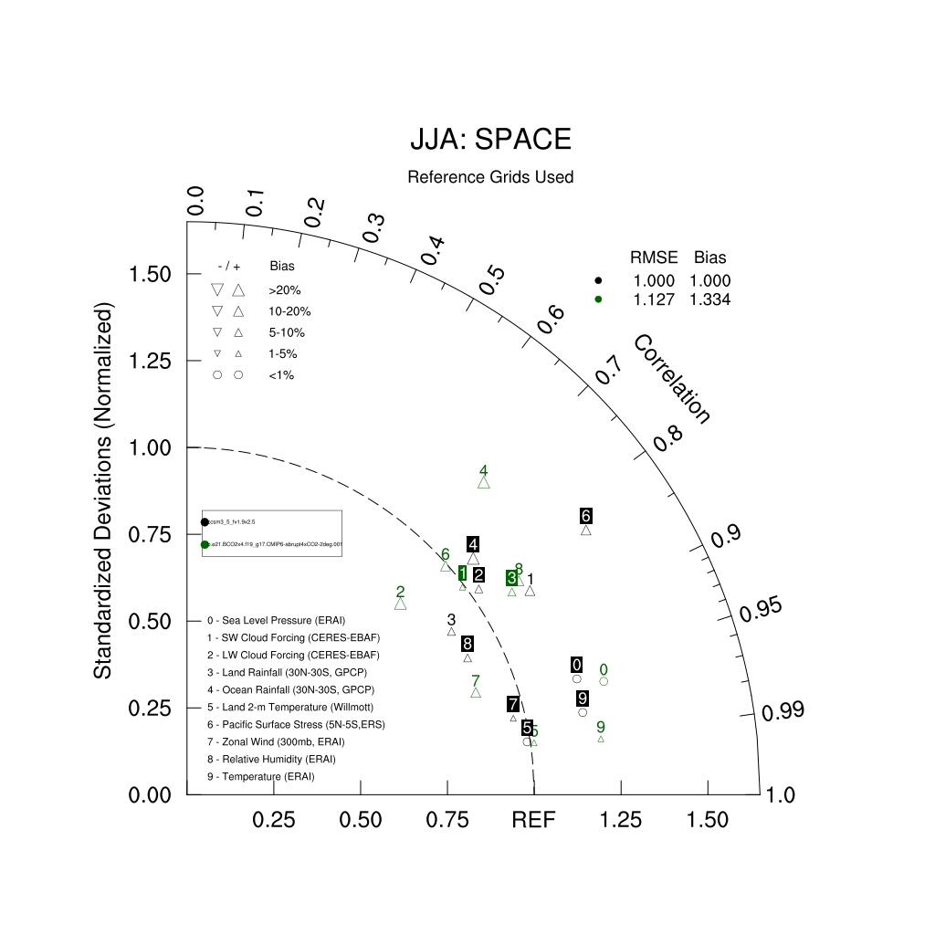 Taylor Diagrams were developed by Karl Taylor at PCMDI (paper|tech note) and aim to condense information about variance and RMSE characteristics of a particular model run when compared with observations in a single diagram. The tables summarize the individual metrics for each variable considered including: