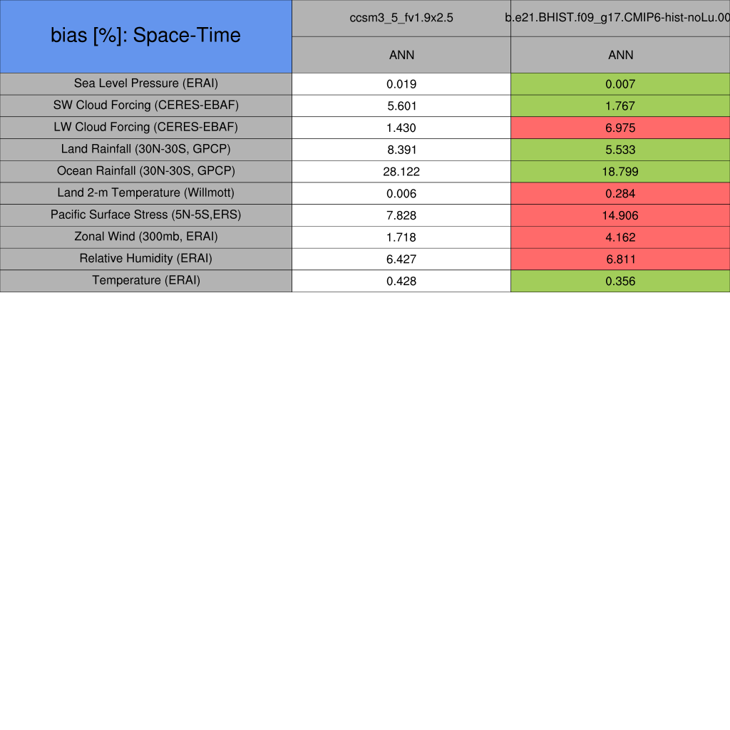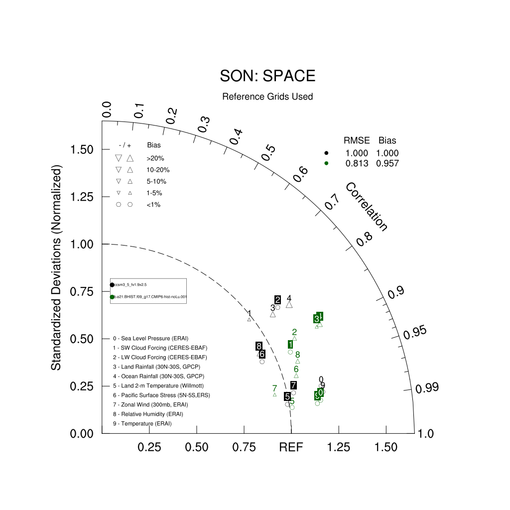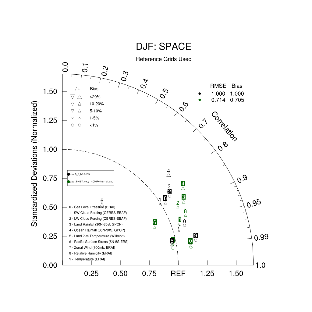 Taylor Diagrams were developed by Karl Taylor at PCMDI (paper|tech note) and aim to condense information about variance and RMSE characteristics of a particular model run when compared with observations in a single diagram. The tables summarize the individual metrics for each variable considered including: