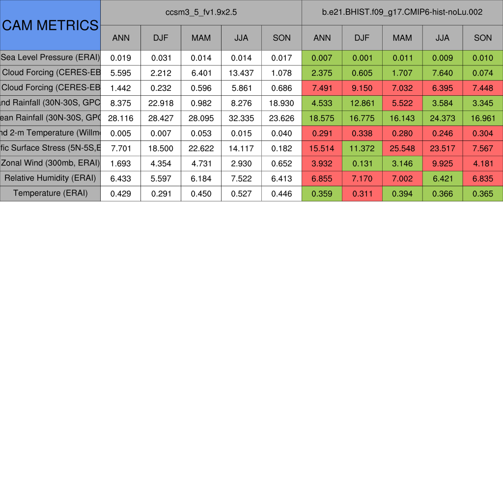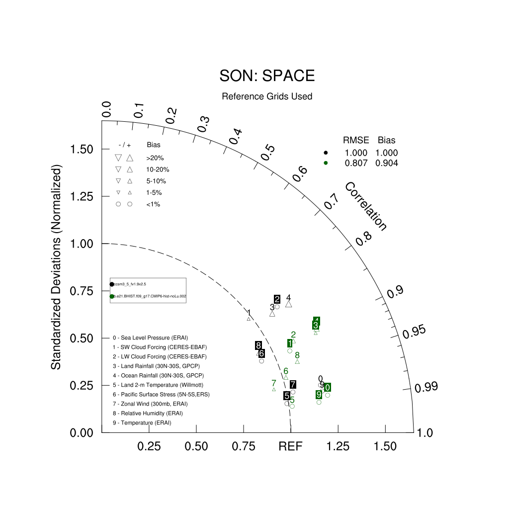 Taylor Diagrams were developed by Karl Taylor at PCMDI (paper|tech note) and aim to condense information about variance and RMSE characteristics of a particular model run when compared with observations in a single diagram. The tables summarize the individual metrics for each variable considered including: