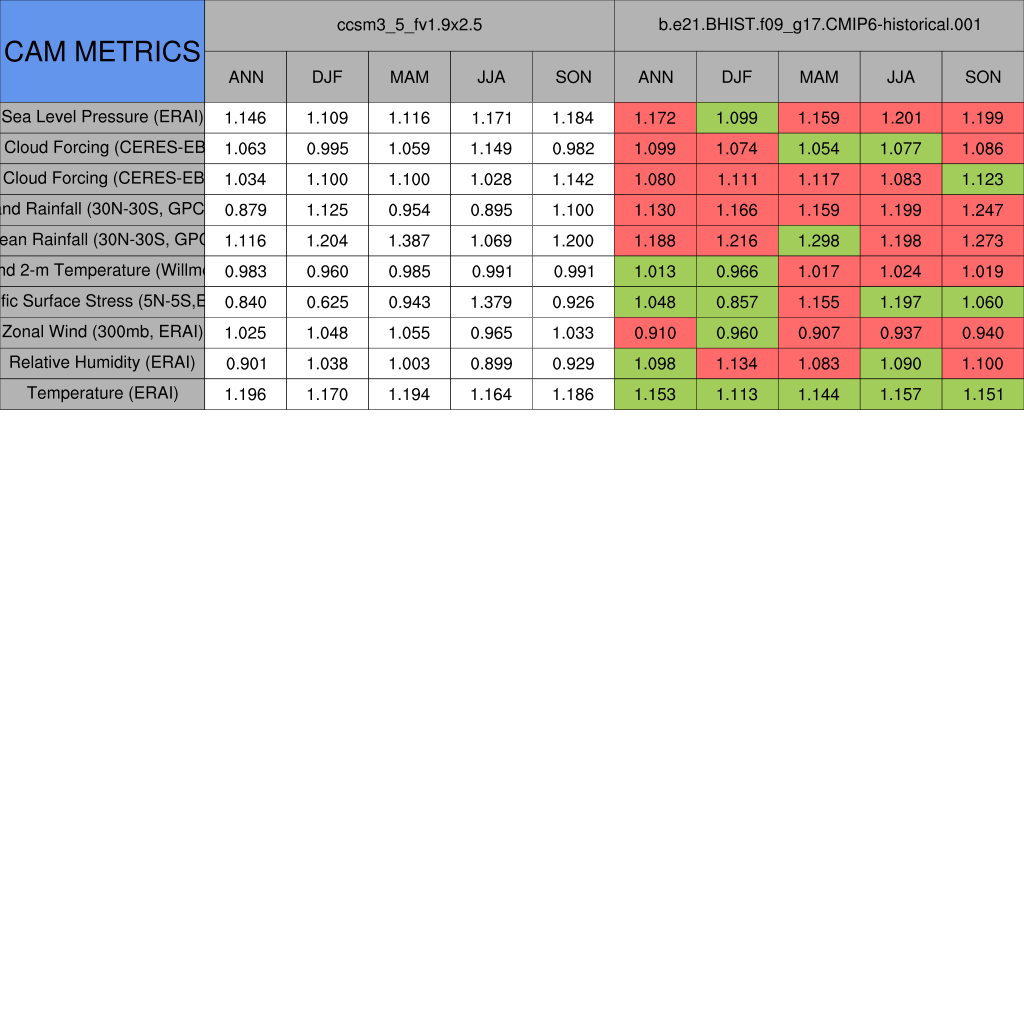 Taylor Diagrams were developed by Karl Taylor at PCMDI (paper|tech note) and aim to condense information about variance and RMSE characteristics of a particular model run when compared with observations in a single diagram. The tables summarize the individual metrics for each variable considered including: