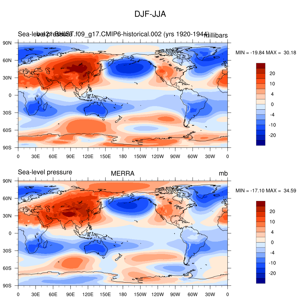b.e21.BHIST.f09_g17.CMIP6-historical.002DIAG Set 9 - Horizontal contour plots of DJF-JJA differences
