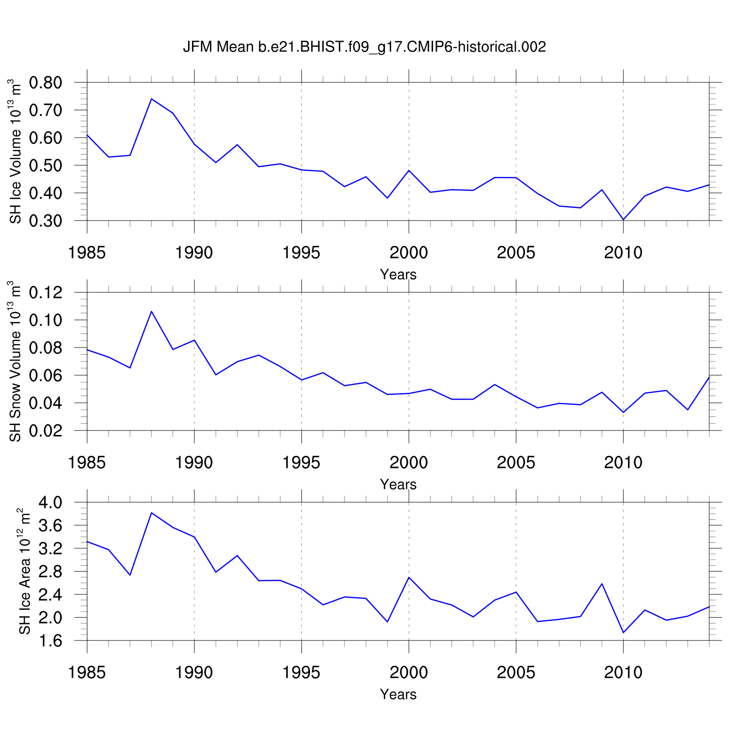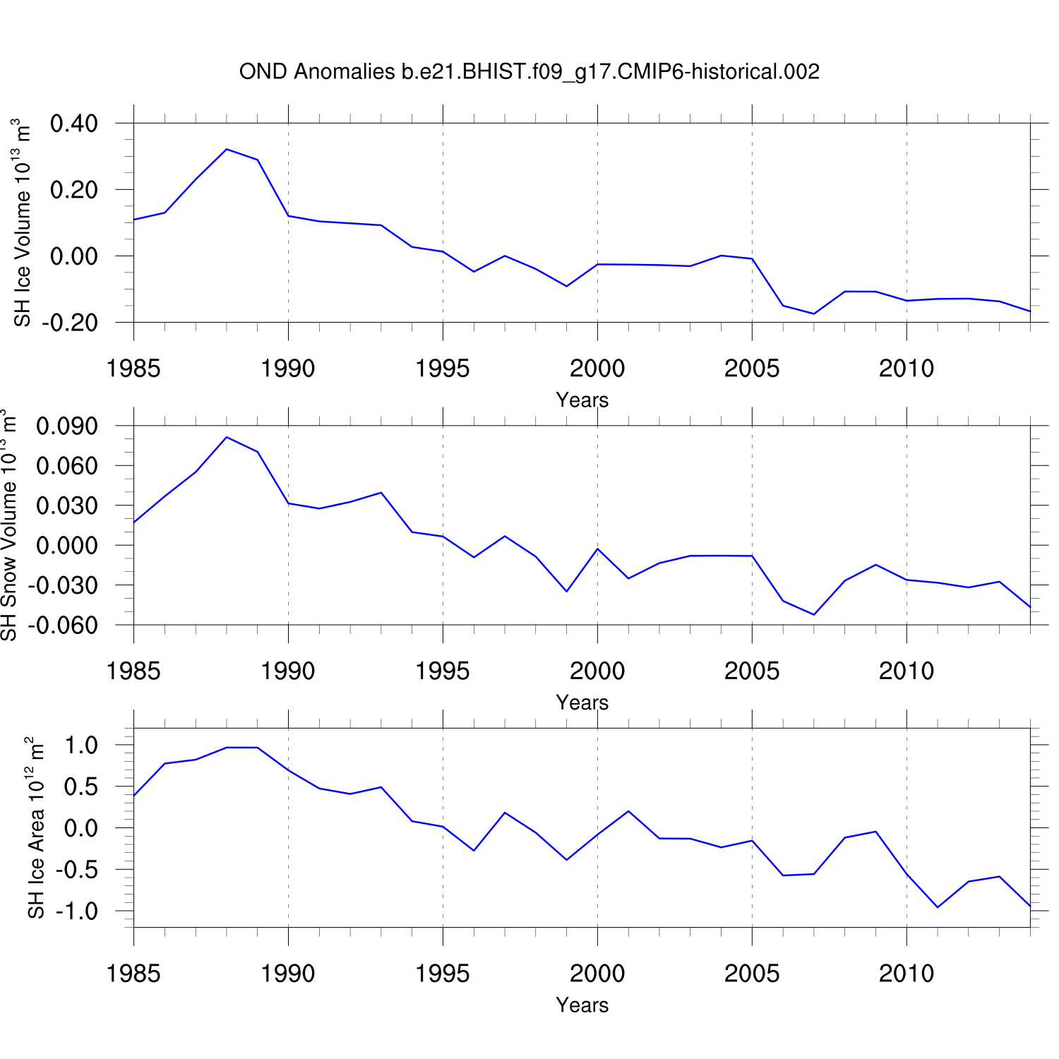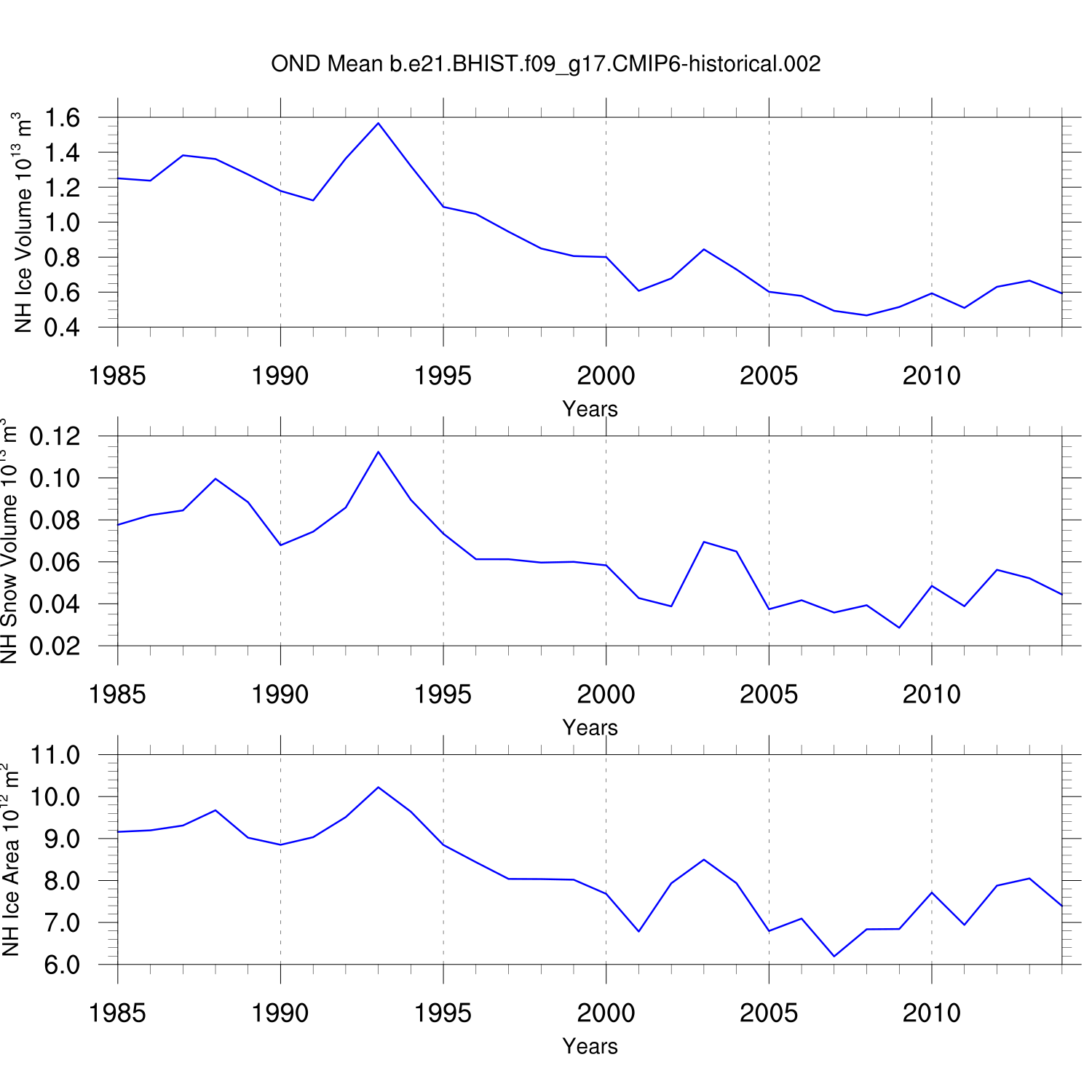 Time Series of Ice Volume, Snow Volume and Ice Area NH SH