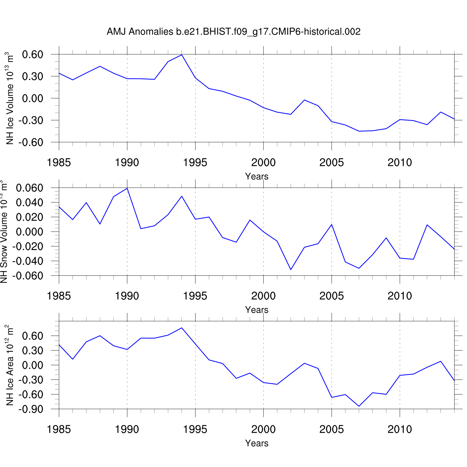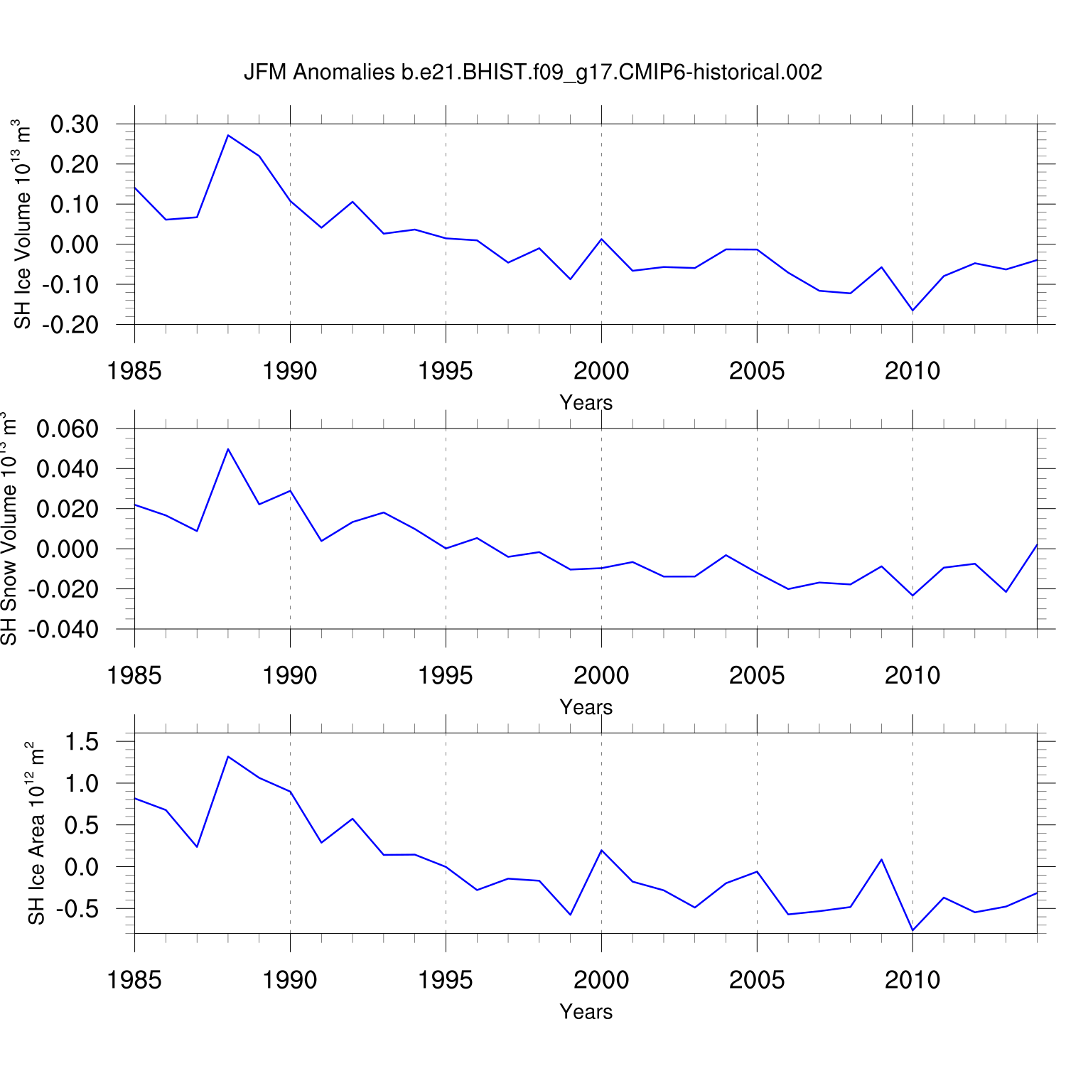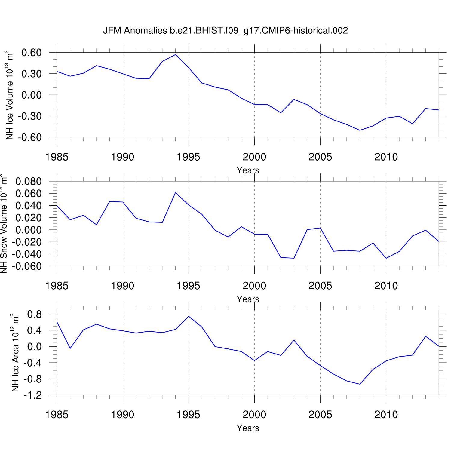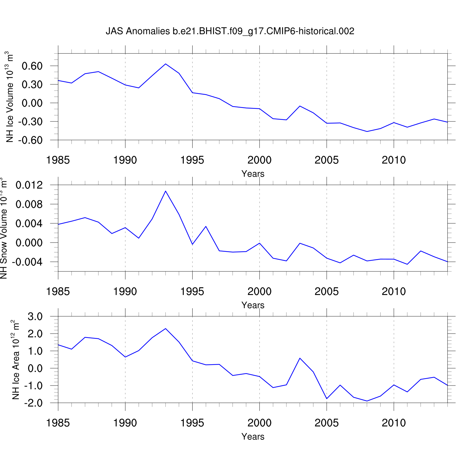 Time Series of Ice Volume, Snow Volume and Ice Area NH SH