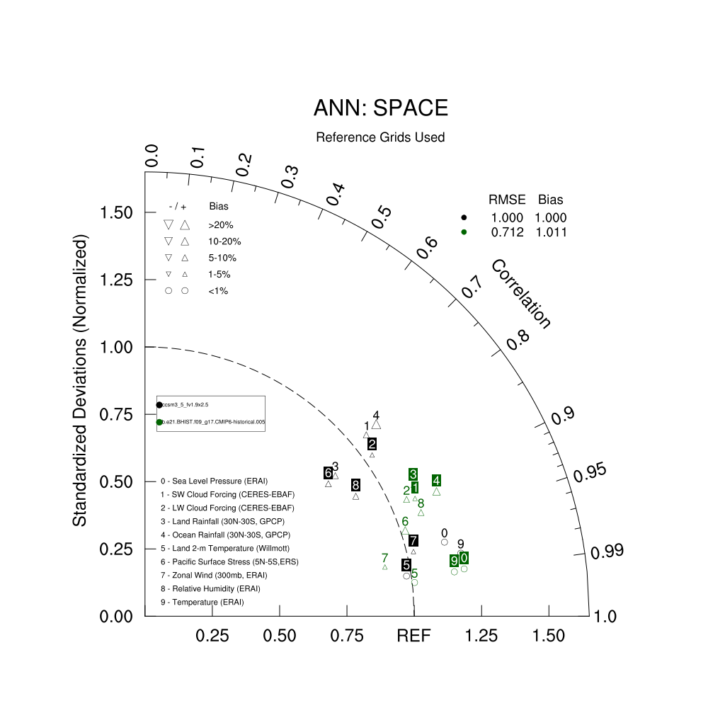 Taylor Diagrams were developed by Karl Taylor at PCMDI (paper|tech note) and aim to condense information about variance and RMSE characteristics of a particular model run when compared with observations in a single diagram. The tables summarize the individual metrics for each variable considered including: