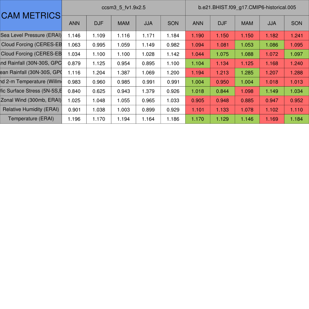 Taylor Diagrams were developed by Karl Taylor at PCMDI (paper|tech note) and aim to condense information about variance and RMSE characteristics of a particular model run when compared with observations in a single diagram. The tables summarize the individual metrics for each variable considered including: