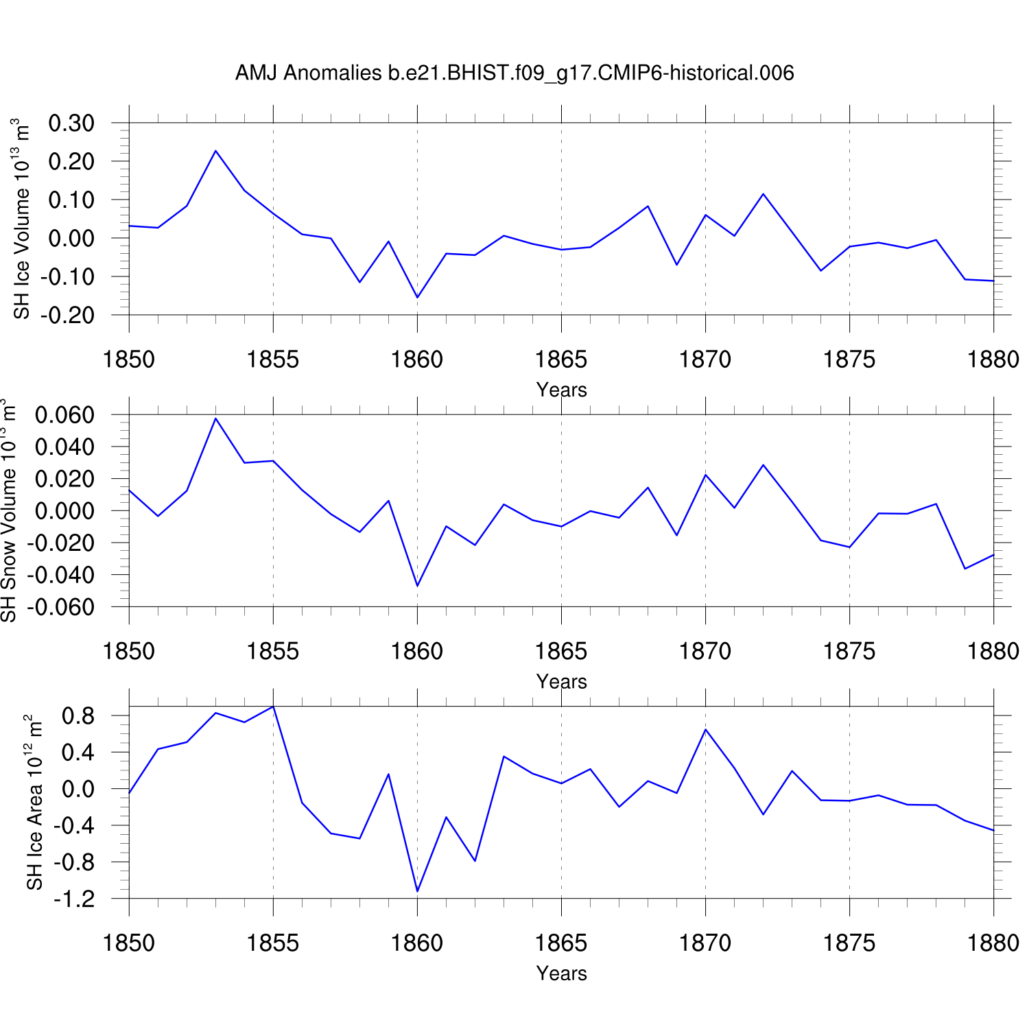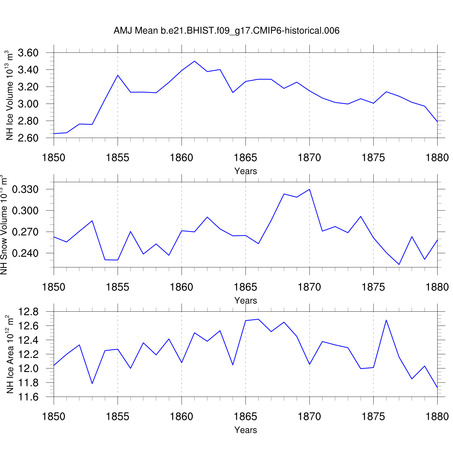 Time Series of Ice Volume, Snow Volume and Ice Area NH SH