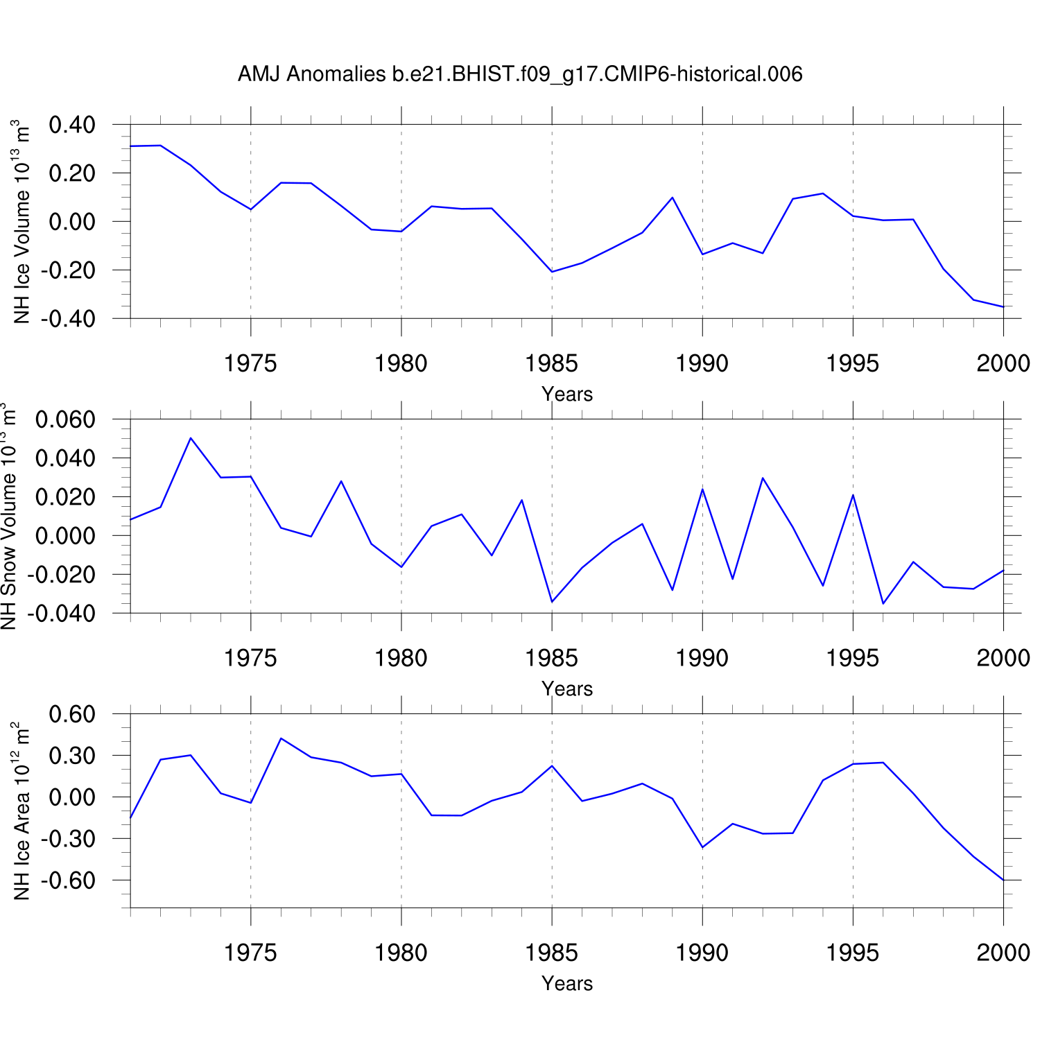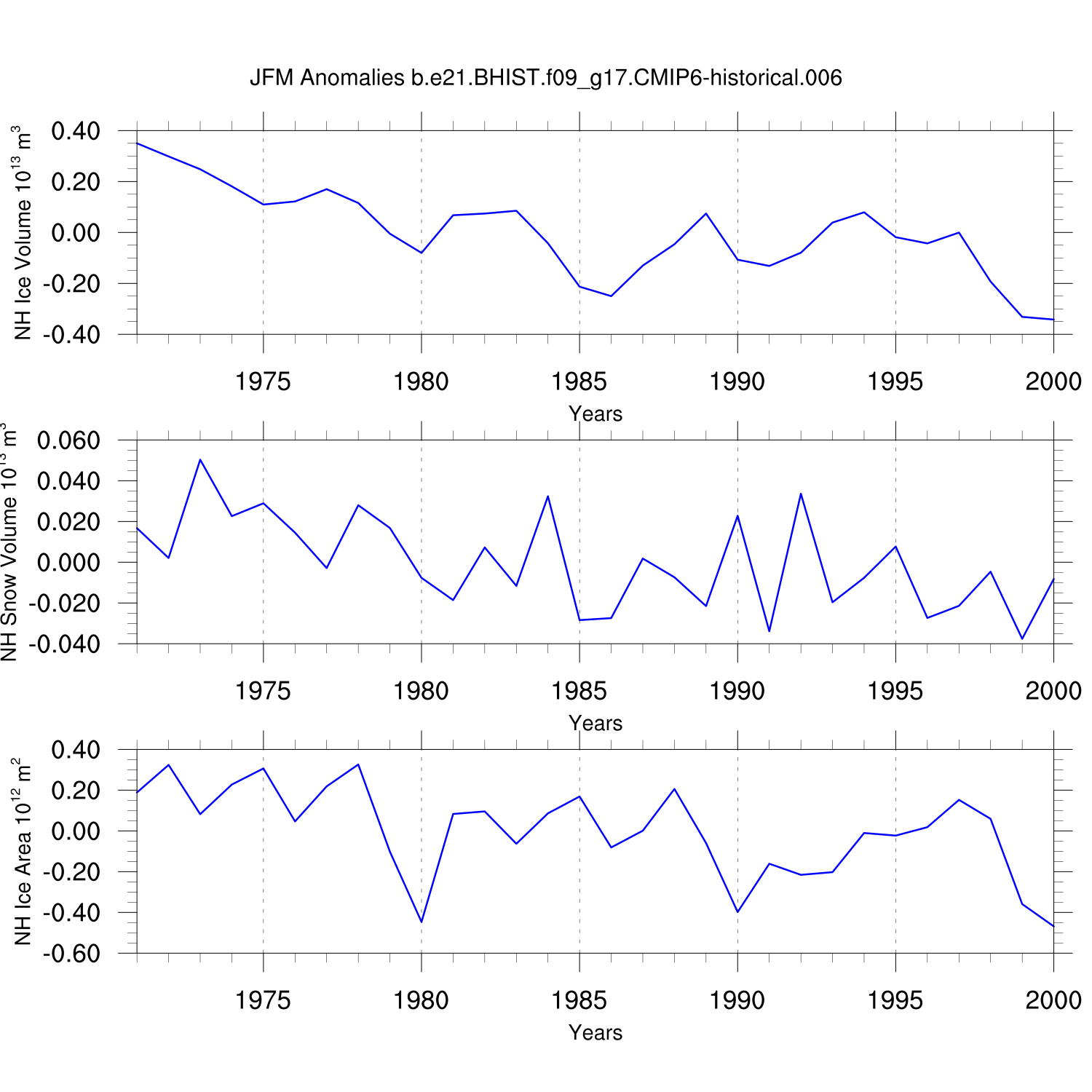 Time Series of Ice Volume, Snow Volume and Ice Area NH SH