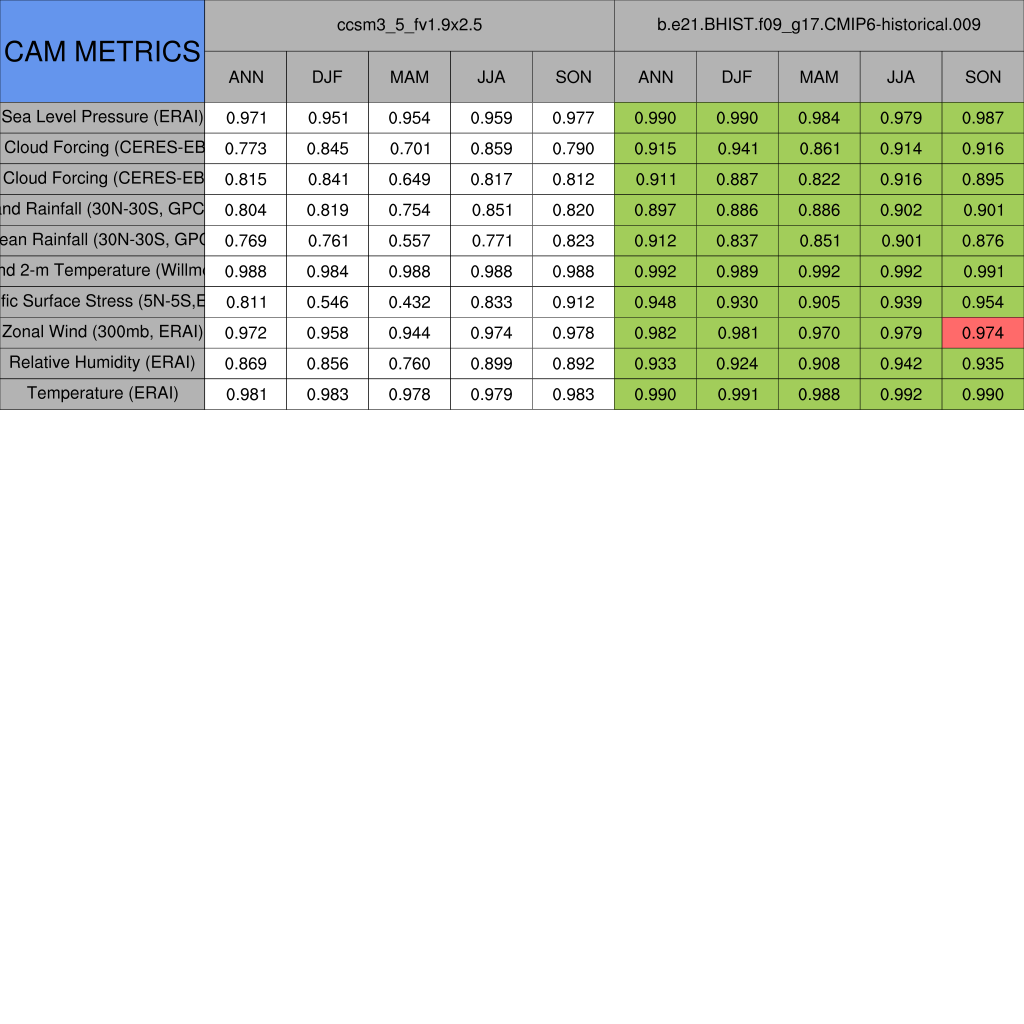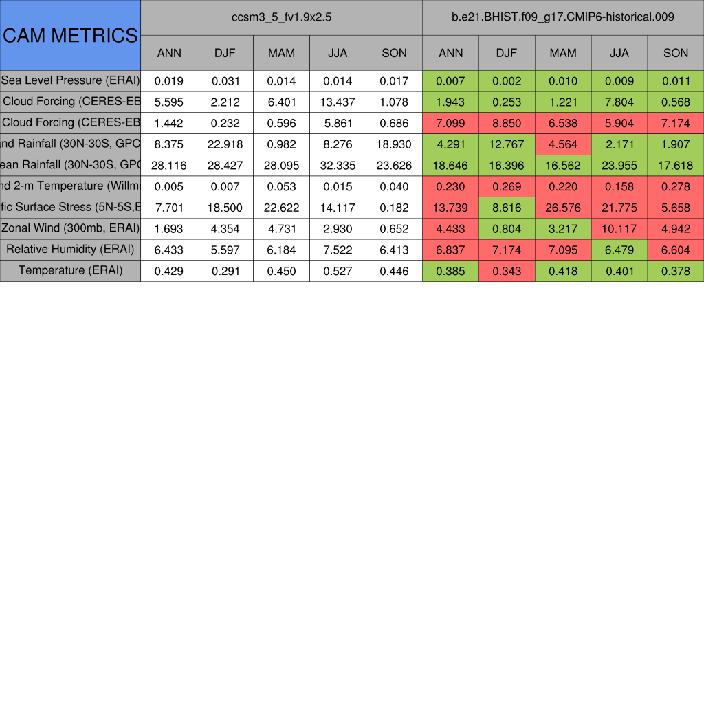 Taylor Diagrams were developed by Karl Taylor at PCMDI (paper|tech note) and aim to condense information about variance and RMSE characteristics of a particular model run when compared with observations in a single diagram. The tables summarize the individual metrics for each variable considered including: