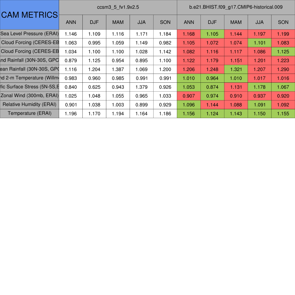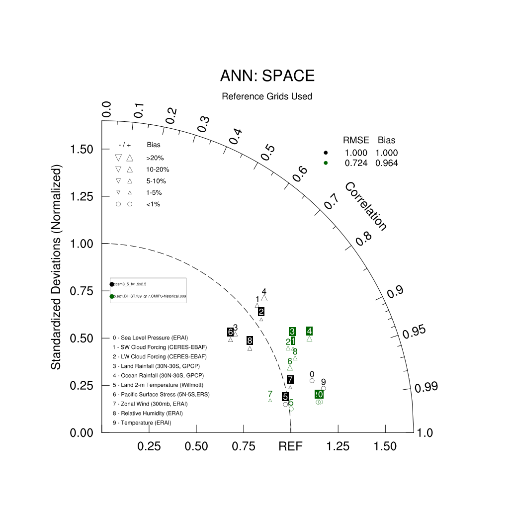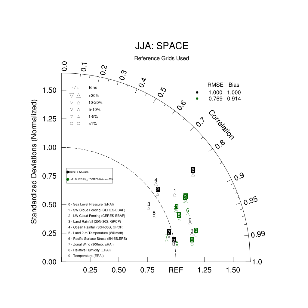 Taylor Diagrams were developed by Karl Taylor at PCMDI (paper|tech note) and aim to condense information about variance and RMSE characteristics of a particular model run when compared with observations in a single diagram. The tables summarize the individual metrics for each variable considered including: