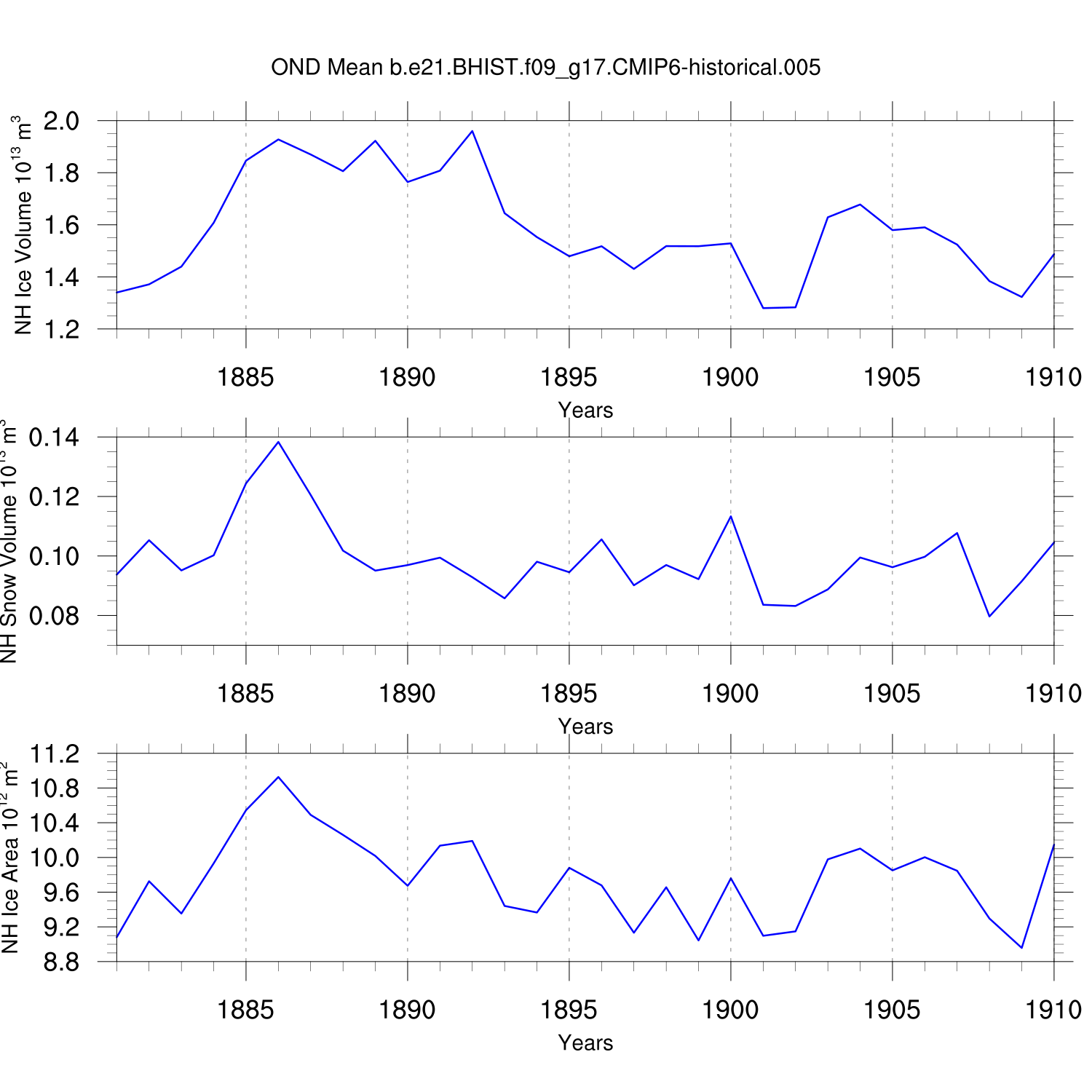Time Series of Ice Volume, Snow Volume and Ice Area NH SH