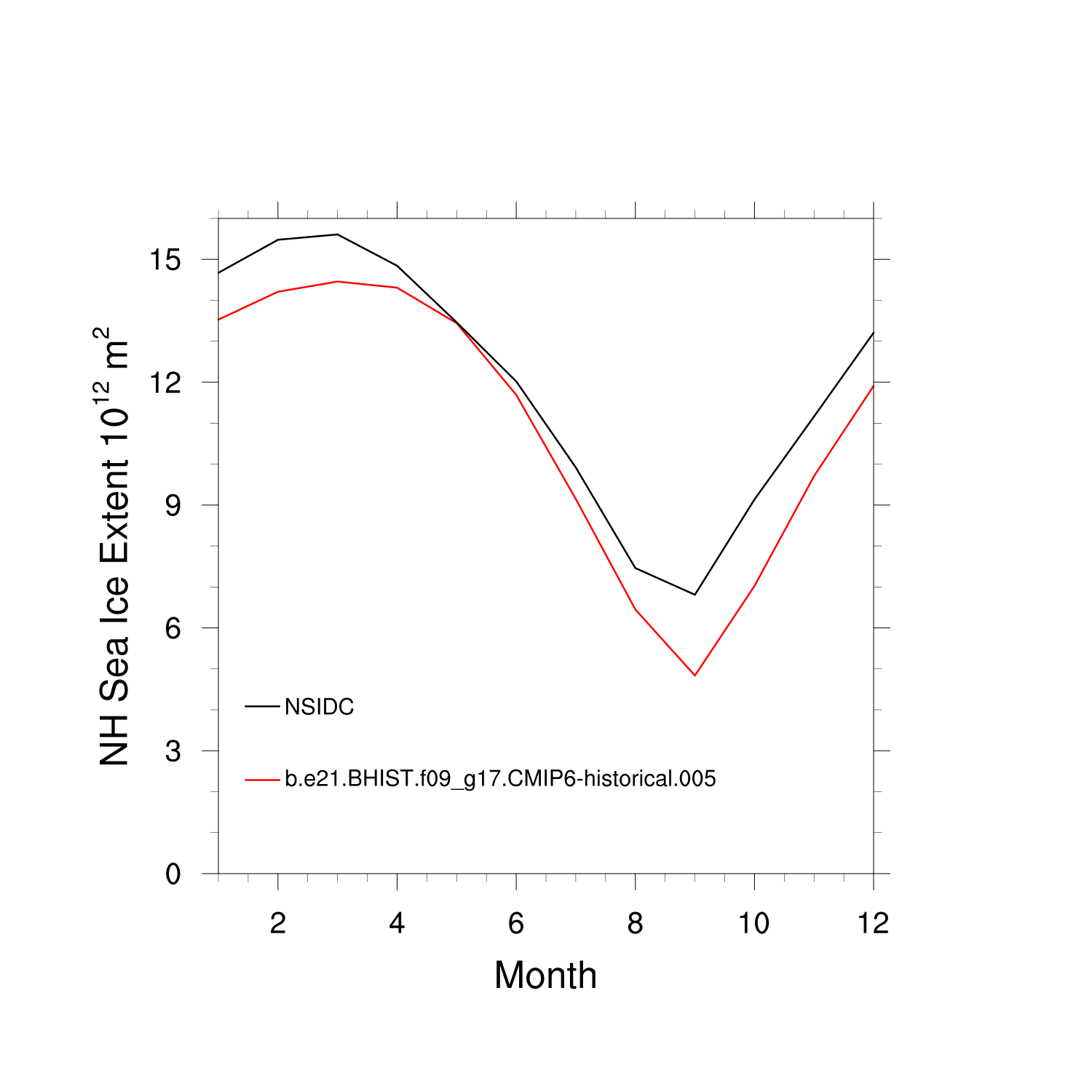 Climatological Monthly Mean Extent vs Obs plot plot