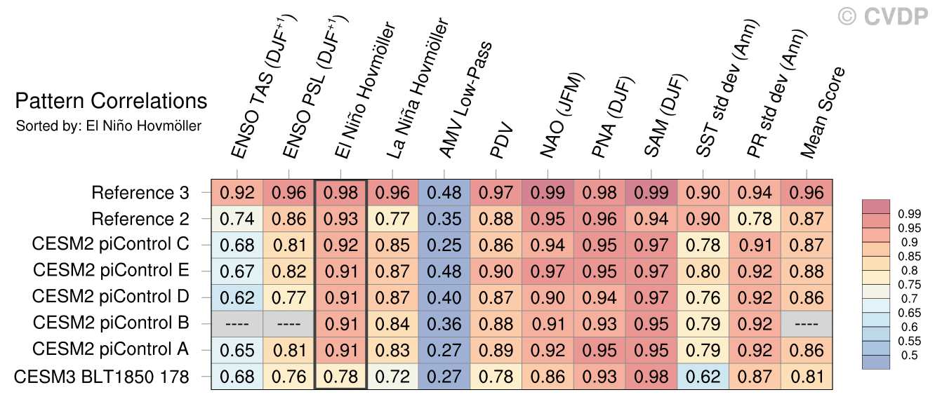 | Sort By: | Namelist (default) | Namelist (Alphabetically) | ENSO TAS | ENSO PSL | El Niño Hovmöller | La Niña Hovmöller | AMV Low-Pass | PDV | NAO | PNA | SAM | SST std dev | PR std dev | Mean Score |