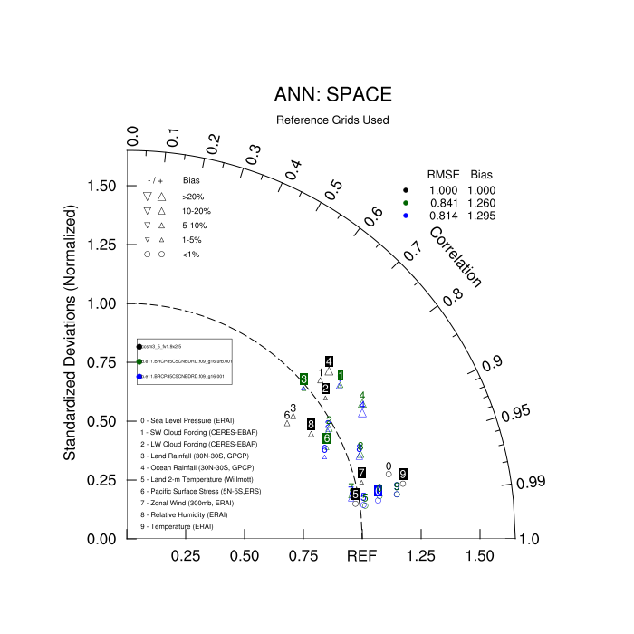 Taylor Diagrams were developed by Karl Taylor at PCMDI (paper|tech note) and aim to condense information about variance and RMSE characteristics of a particular model run when compared with observations in a single diagram. The tables summarize the individual metrics for each variable considered including: