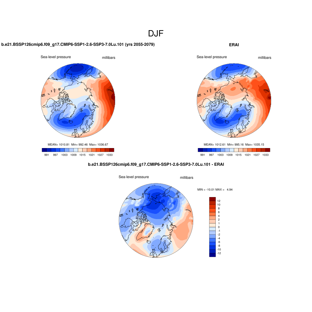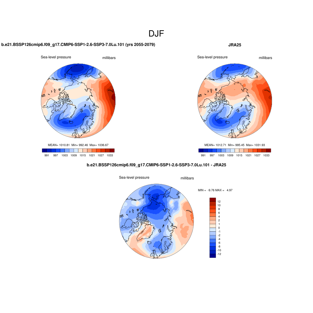 b.e21.BSSP126cmip6.f09_g17.CMIP6-SSP1-2.6-SSP3-7.0Lu.101DIAG Set 7 - Polar contour/vector plots of DJF, JJA and ANN means