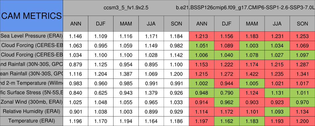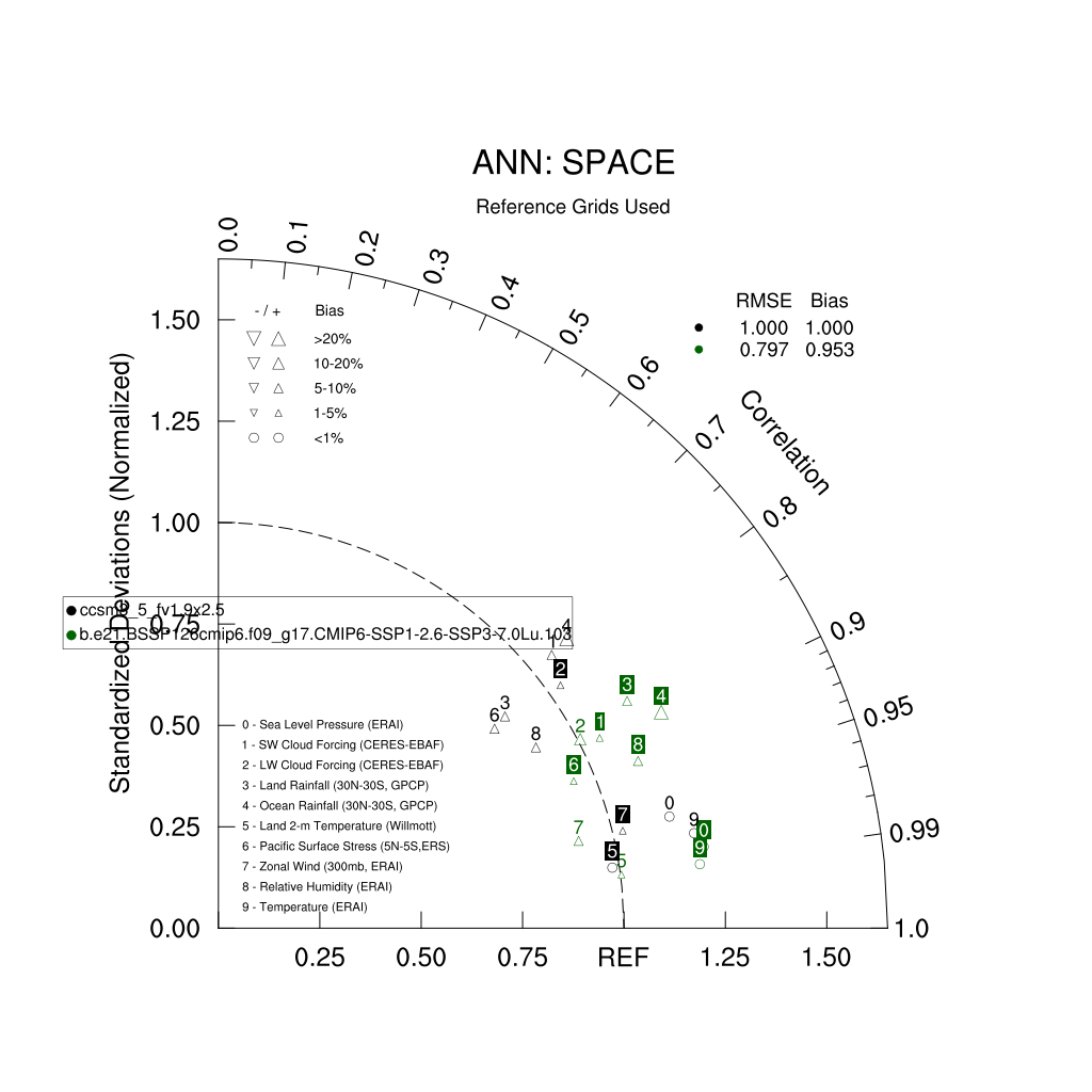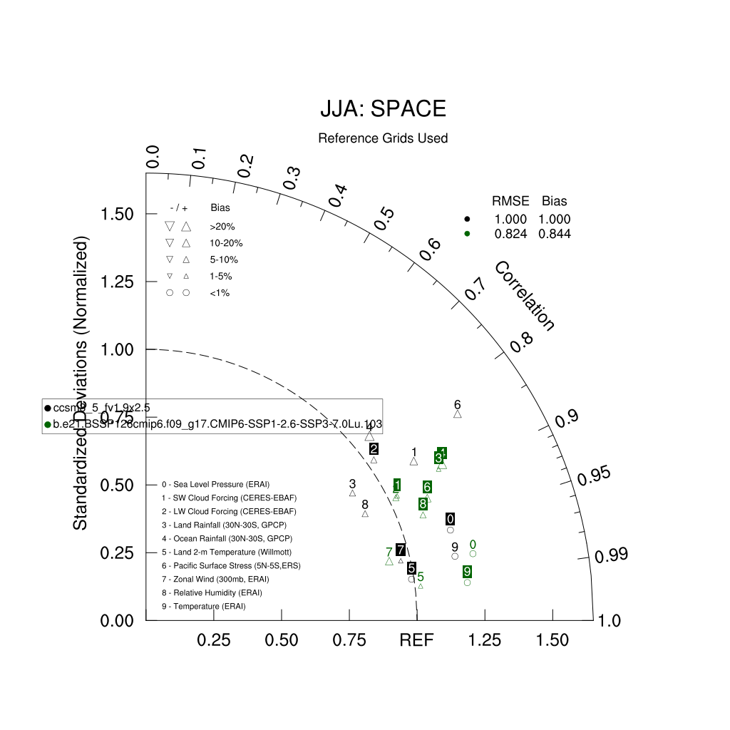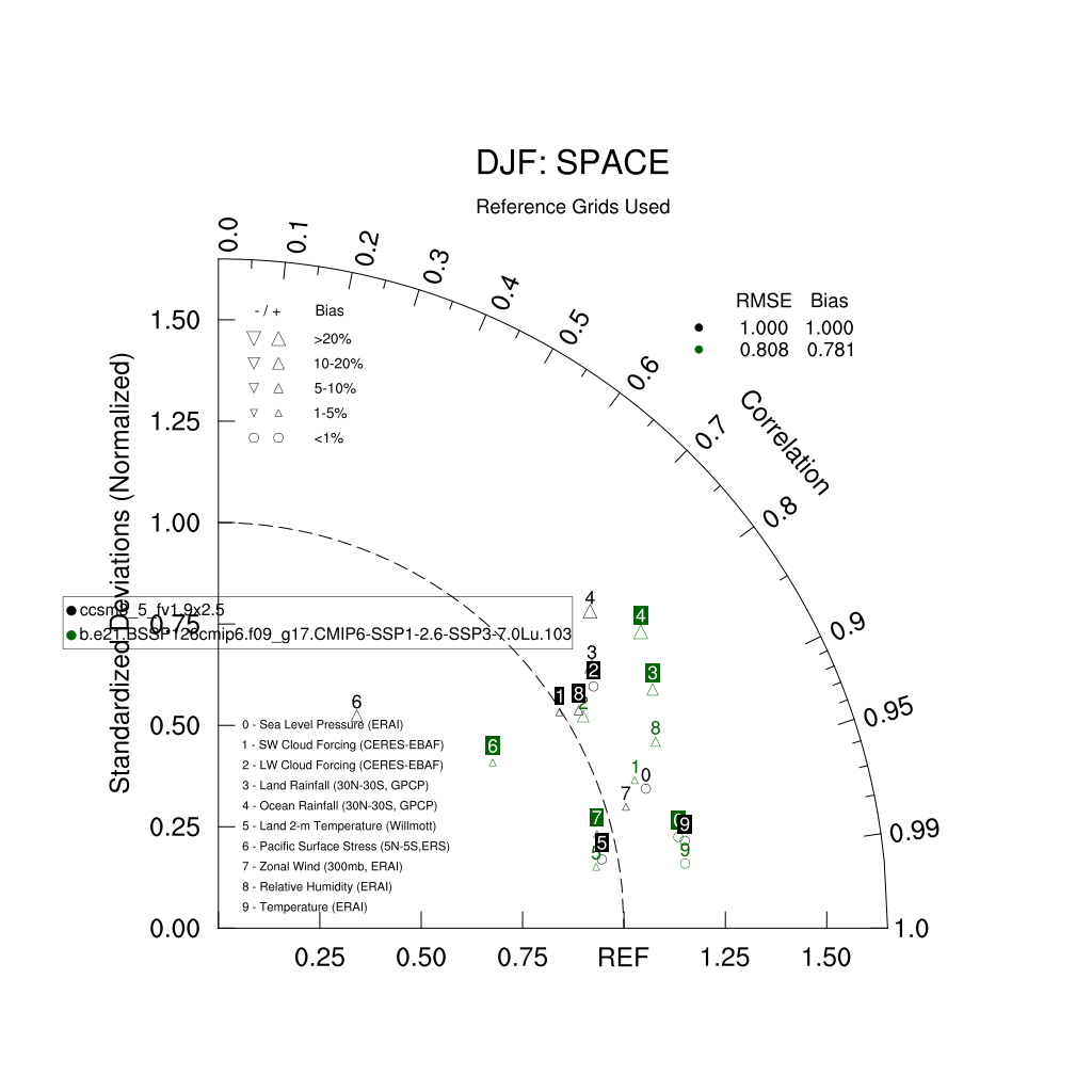 Taylor Diagrams were developed by Karl Taylor at PCMDI (paper|tech note) and aim to condense information about variance and RMSE characteristics of a particular model run when compared with observations in a single diagram. The tables summarize the individual metrics for each variable considered including: