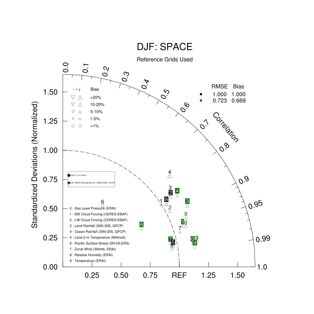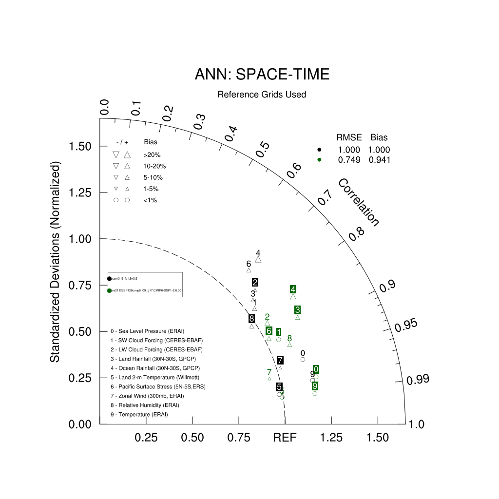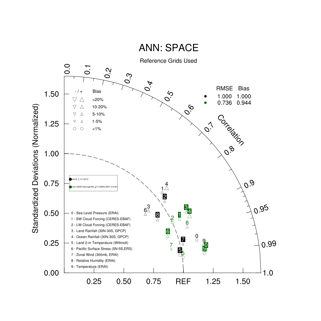 Taylor Diagrams were developed by Karl Taylor at PCMDI (paper|tech note) and aim to condense information about variance and RMSE characteristics of a particular model run when compared with observations in a single diagram. The tables summarize the individual metrics for each variable considered including: