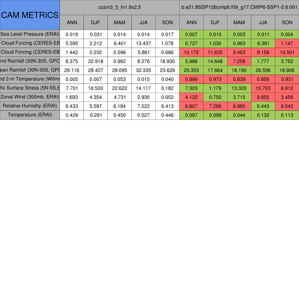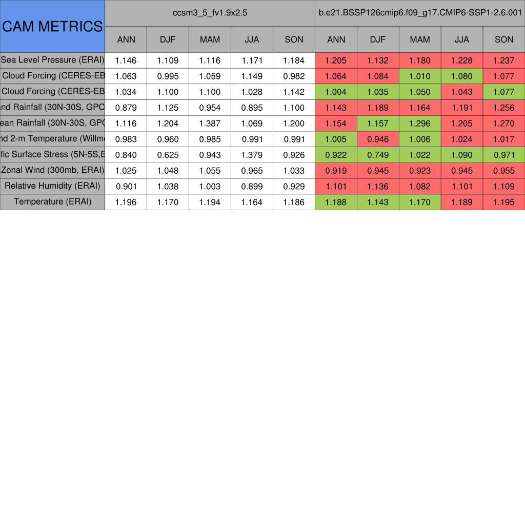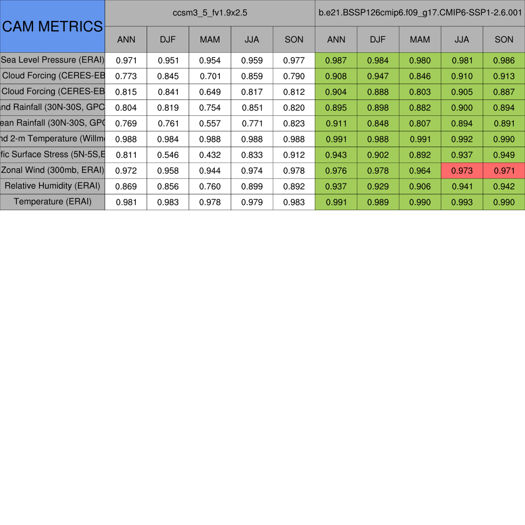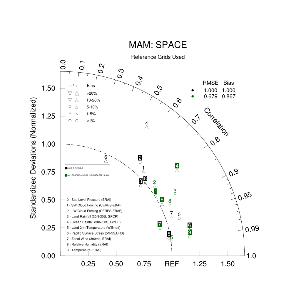 Taylor Diagrams were developed by Karl Taylor at PCMDI (paper|tech note) and aim to condense information about variance and RMSE characteristics of a particular model run when compared with observations in a single diagram. The tables summarize the individual metrics for each variable considered including:
