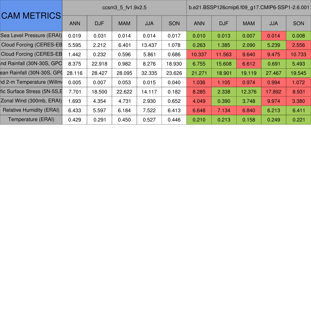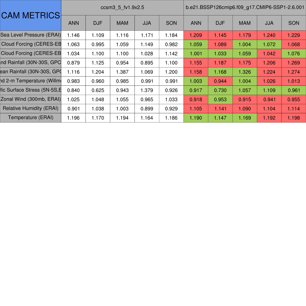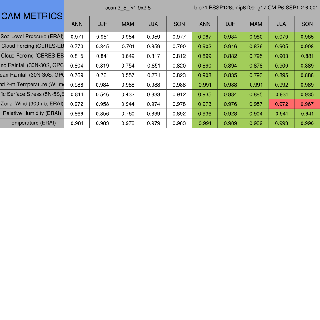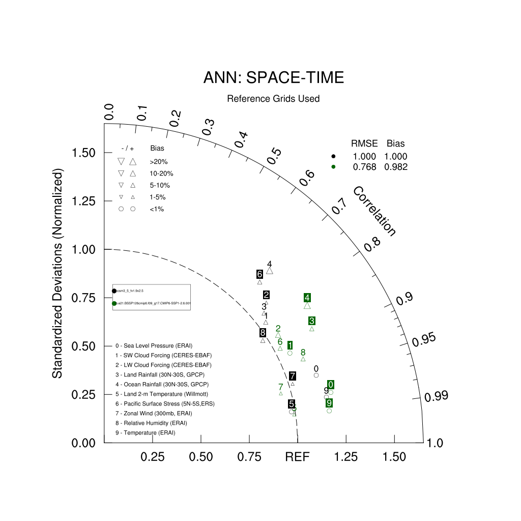 Taylor Diagrams were developed by Karl Taylor at PCMDI (paper|tech note) and aim to condense information about variance and RMSE characteristics of a particular model run when compared with observations in a single diagram. The tables summarize the individual metrics for each variable considered including: