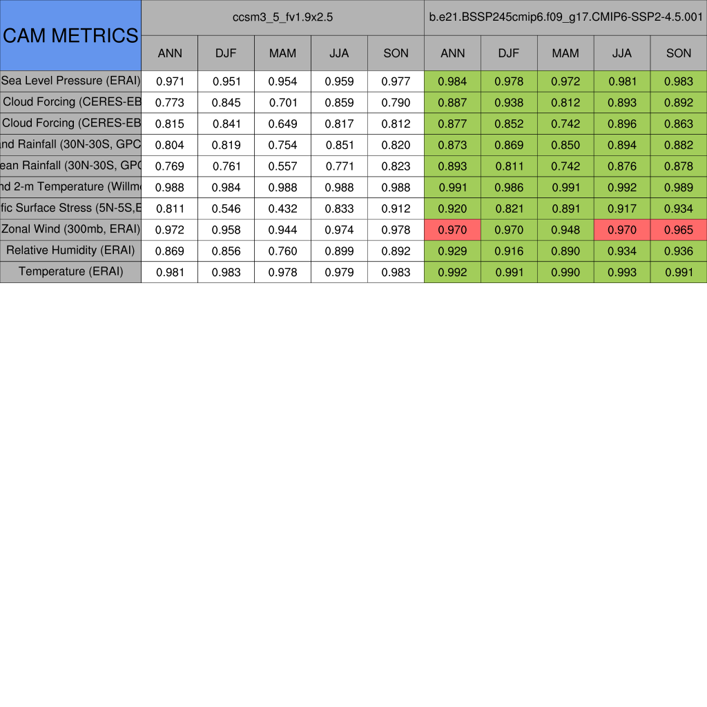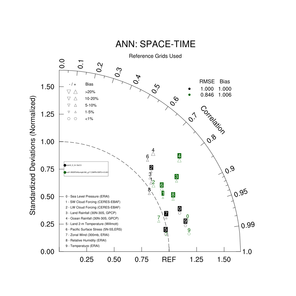 Taylor Diagrams were developed by Karl Taylor at PCMDI (paper|tech note) and aim to condense information about variance and RMSE characteristics of a particular model run when compared with observations in a single diagram. The tables summarize the individual metrics for each variable considered including: