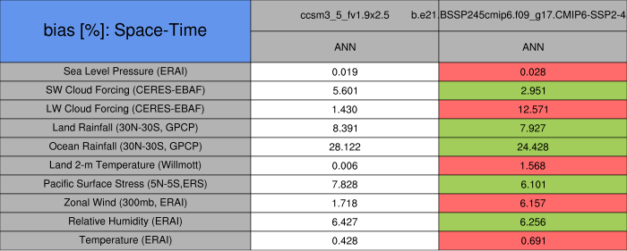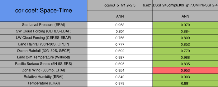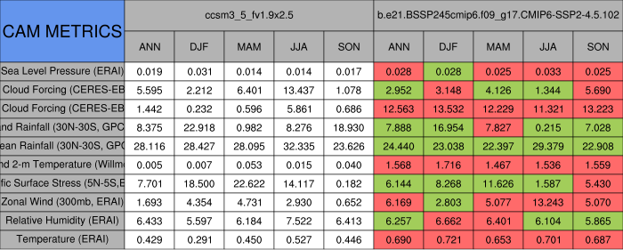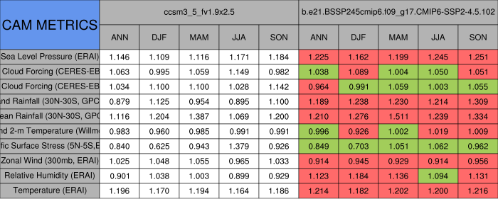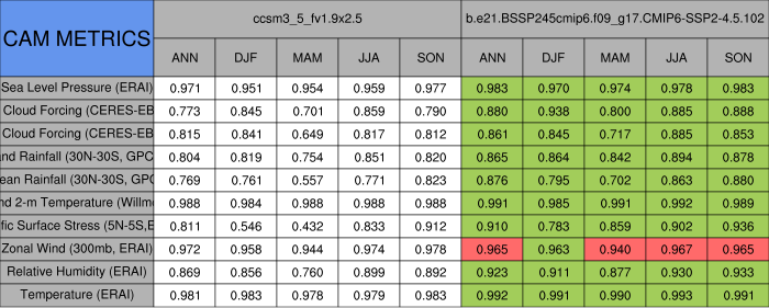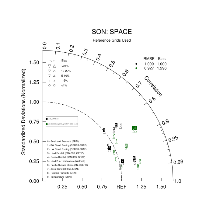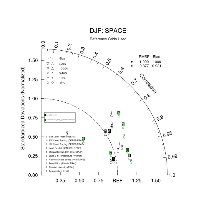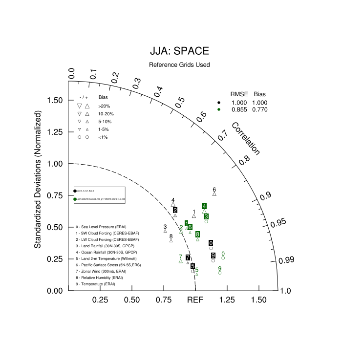 Taylor Diagrams were developed by Karl Taylor at PCMDI (paper|tech note) and aim to condense information about variance and RMSE characteristics of a particular model run when compared with observations in a single diagram. The tables summarize the individual metrics for each variable considered including: