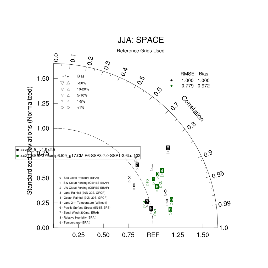 Taylor Diagrams were developed by Karl Taylor at PCMDI (paper|tech note) and aim to condense information about variance and RMSE characteristics of a particular model run when compared with observations in a single diagram. The tables summarize the individual metrics for each variable considered including: