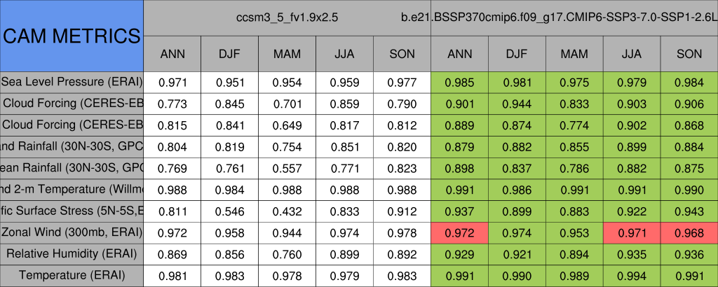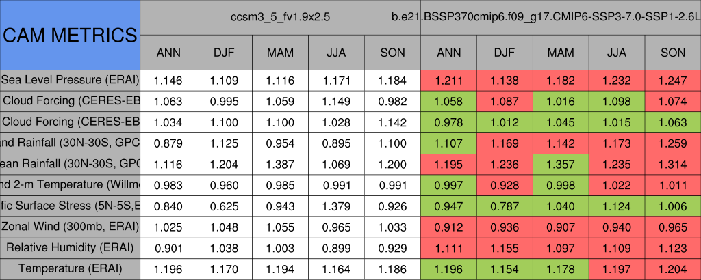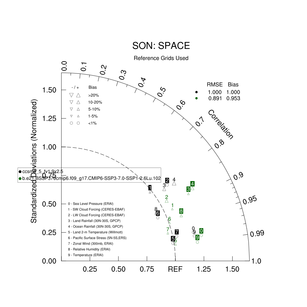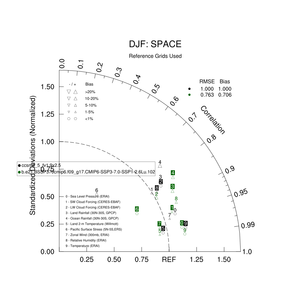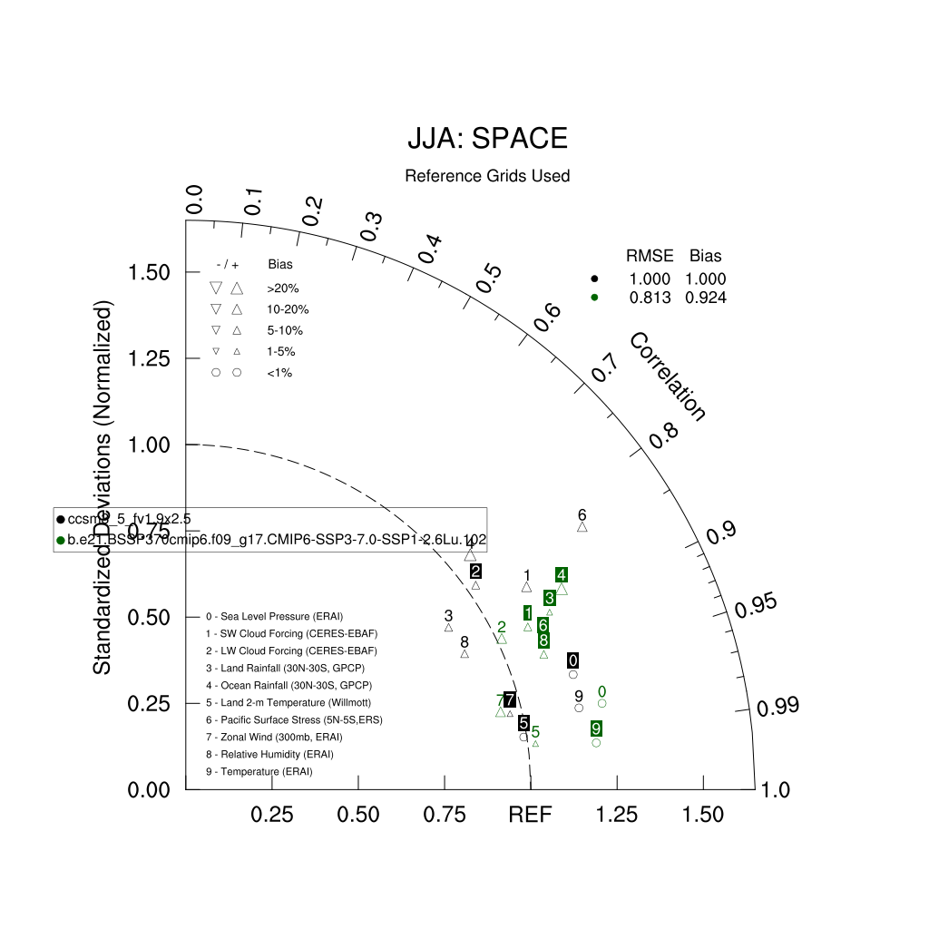 Taylor Diagrams were developed by Karl Taylor at PCMDI (paper|tech note) and aim to condense information about variance and RMSE characteristics of a particular model run when compared with observations in a single diagram. The tables summarize the individual metrics for each variable considered including: