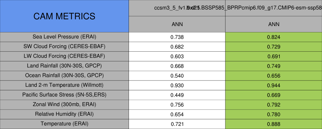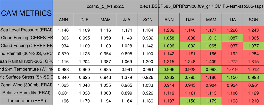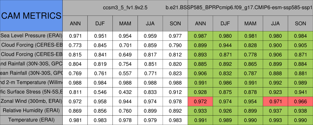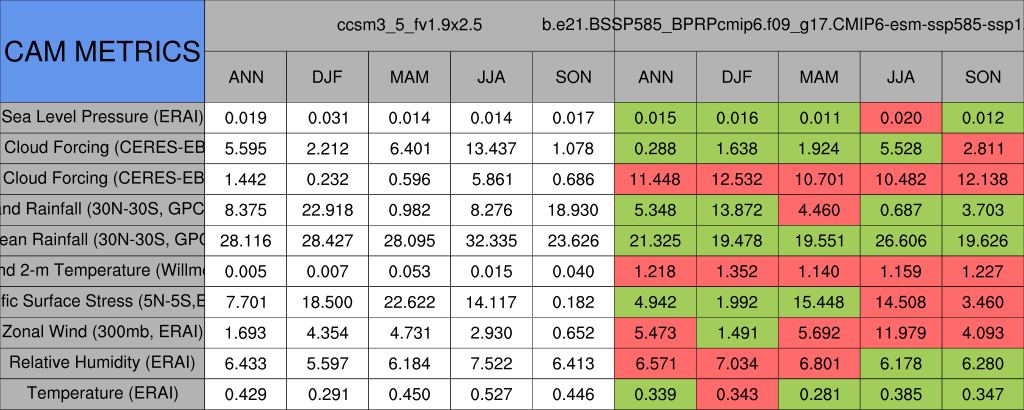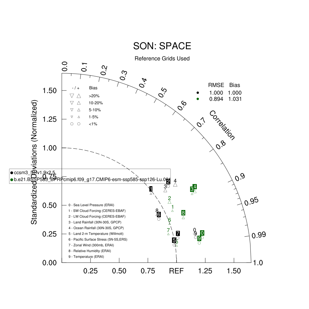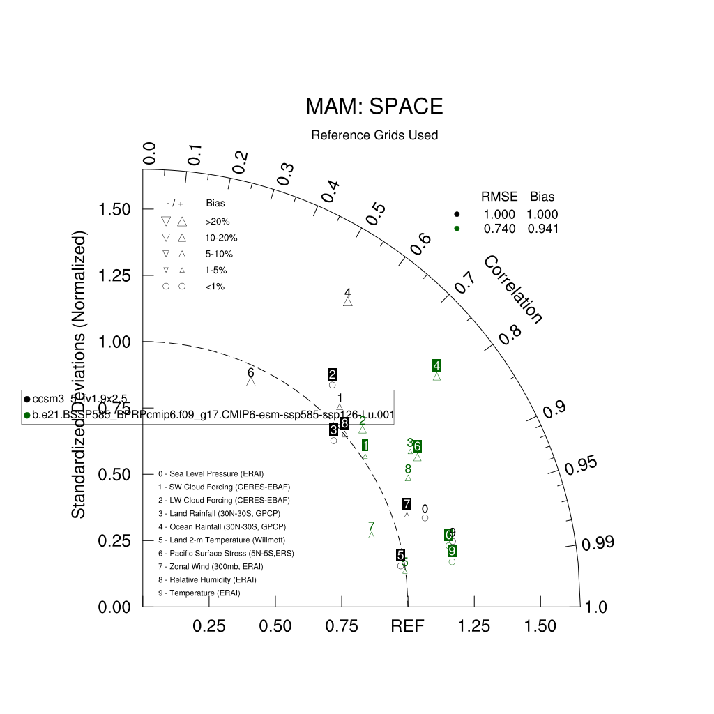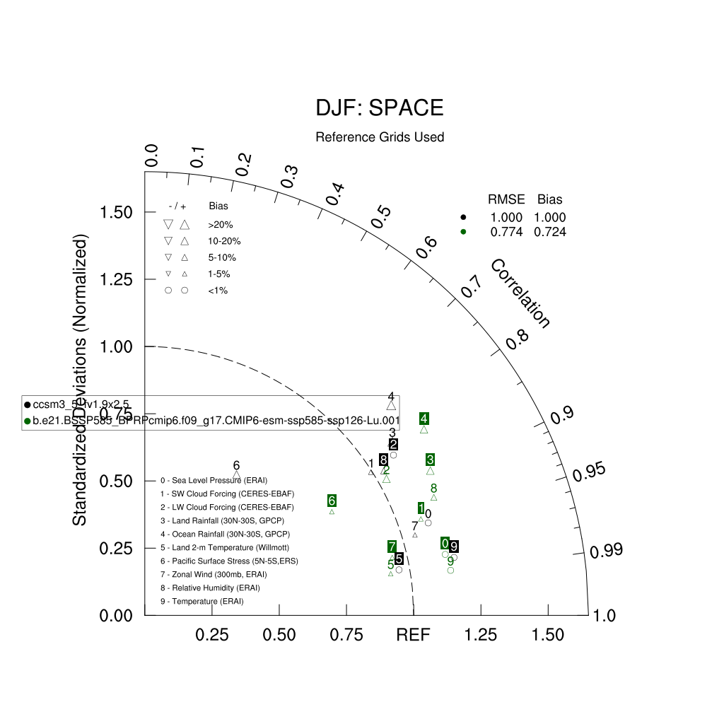 Taylor Diagrams were developed by Karl Taylor at PCMDI (paper|tech note) and aim to condense information about variance and RMSE characteristics of a particular model run when compared with observations in a single diagram. The tables summarize the individual metrics for each variable considered including: