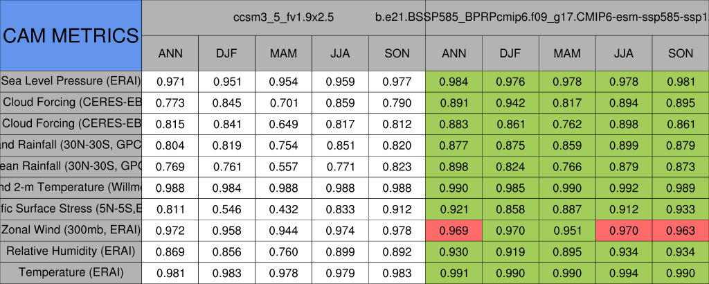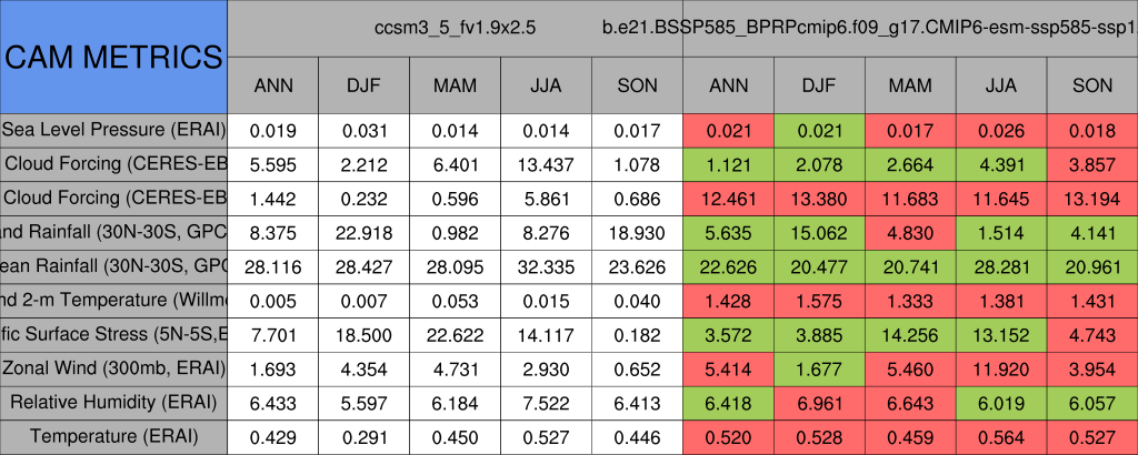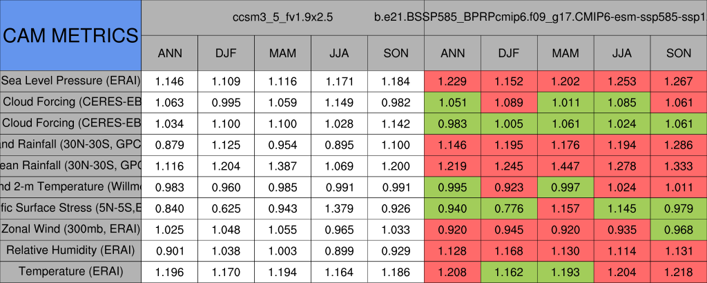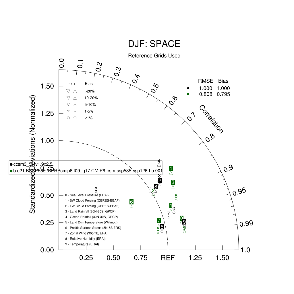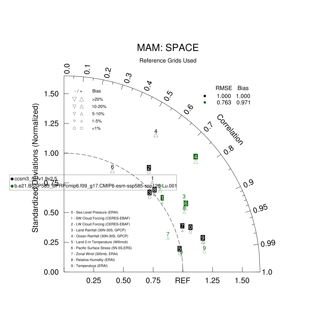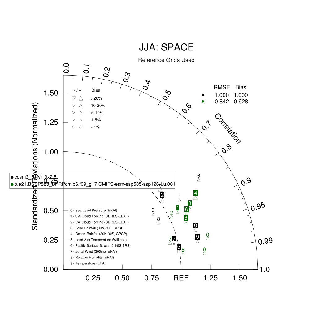 Taylor Diagrams were developed by Karl Taylor at PCMDI (paper|tech note) and aim to condense information about variance and RMSE characteristics of a particular model run when compared with observations in a single diagram. The tables summarize the individual metrics for each variable considered including: