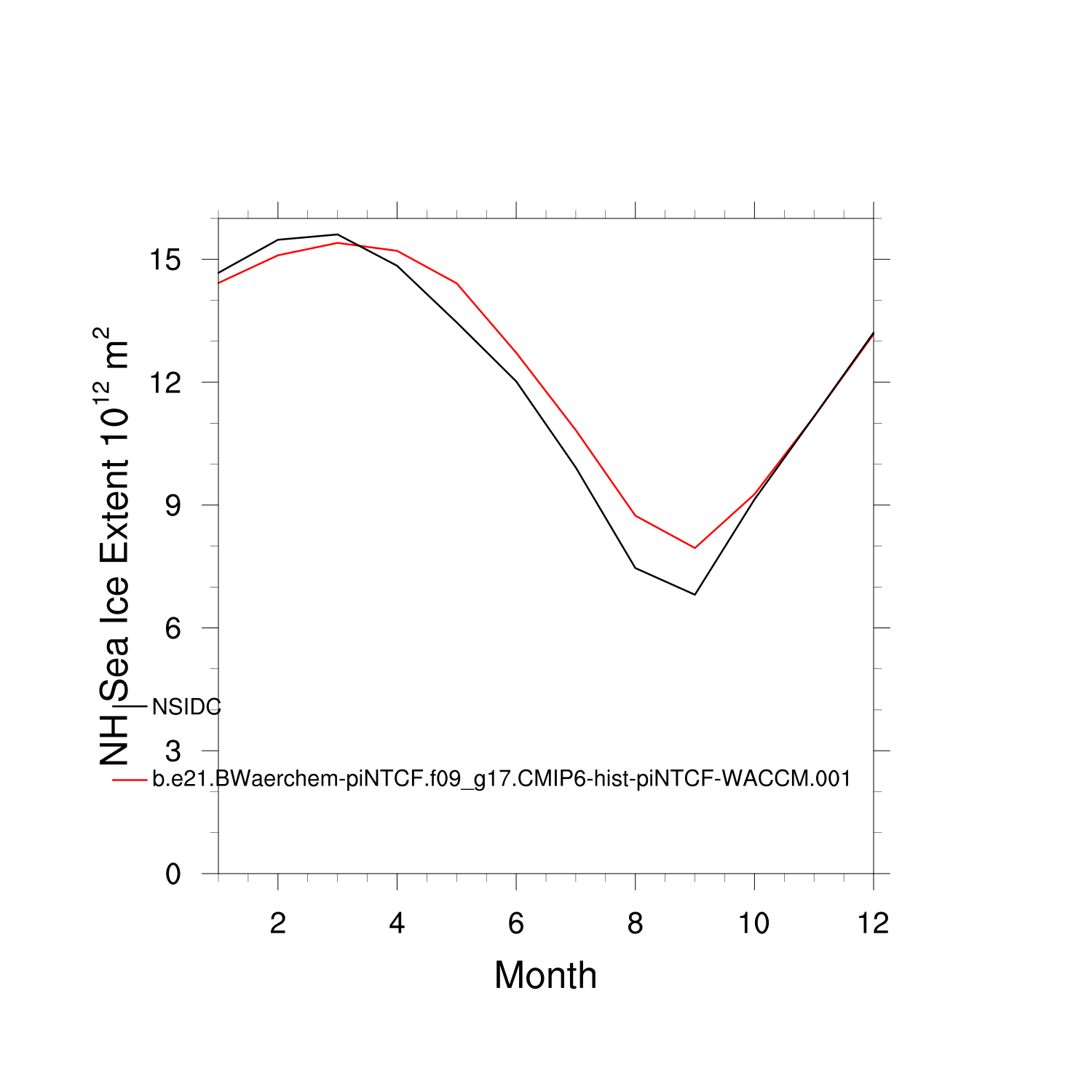 Climatological Monthly Mean Extent vs Obs plot plot