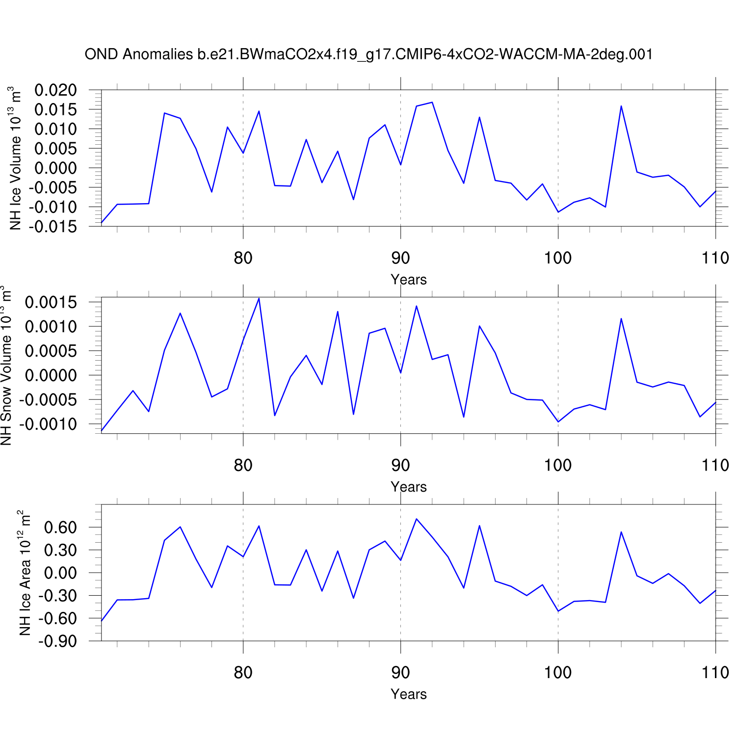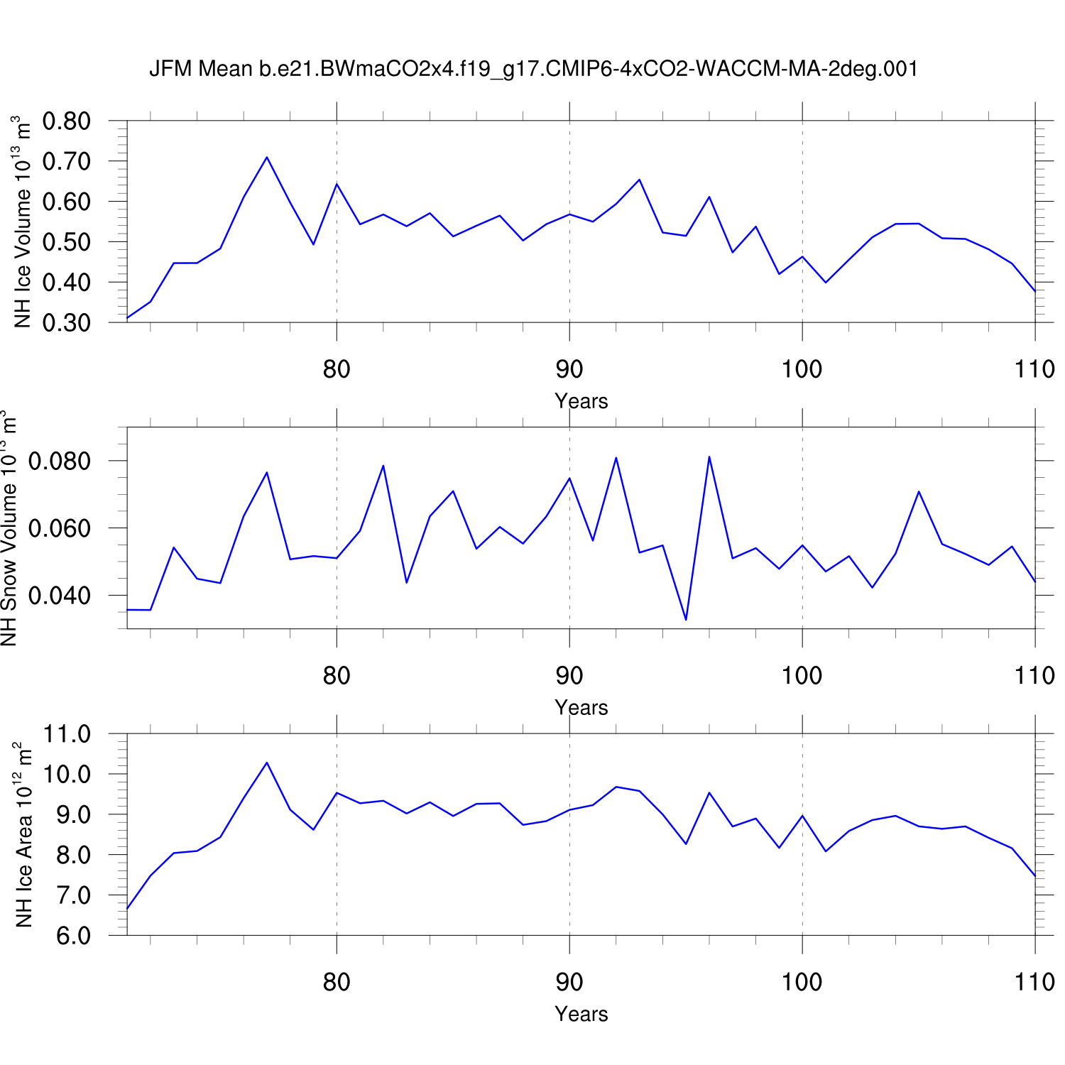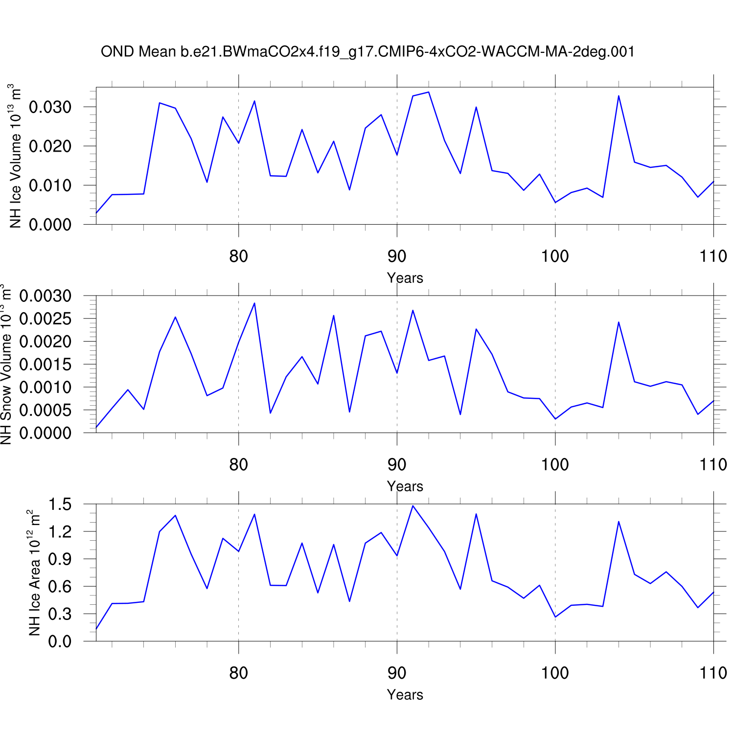Time Series of Ice Volume, Snow Volume and Ice Area NH SH