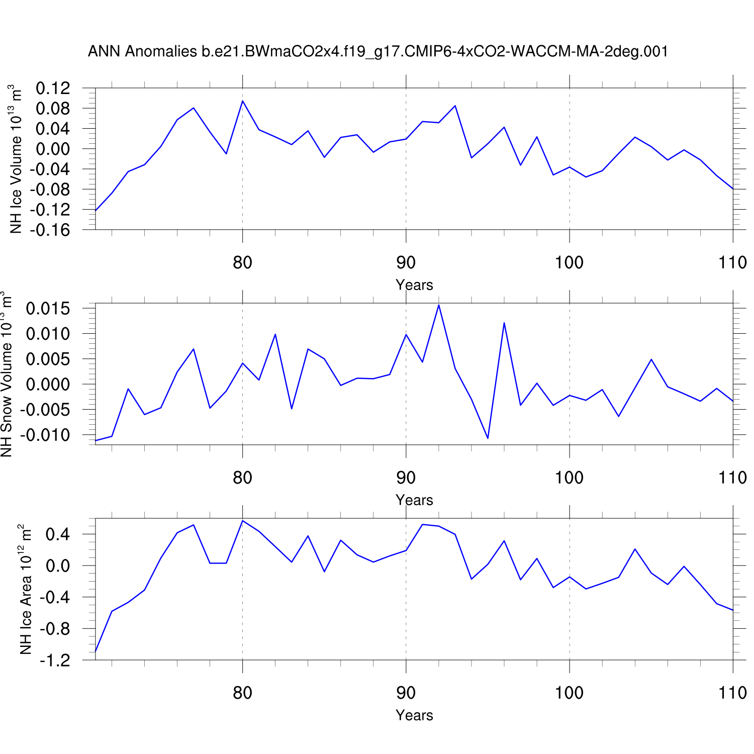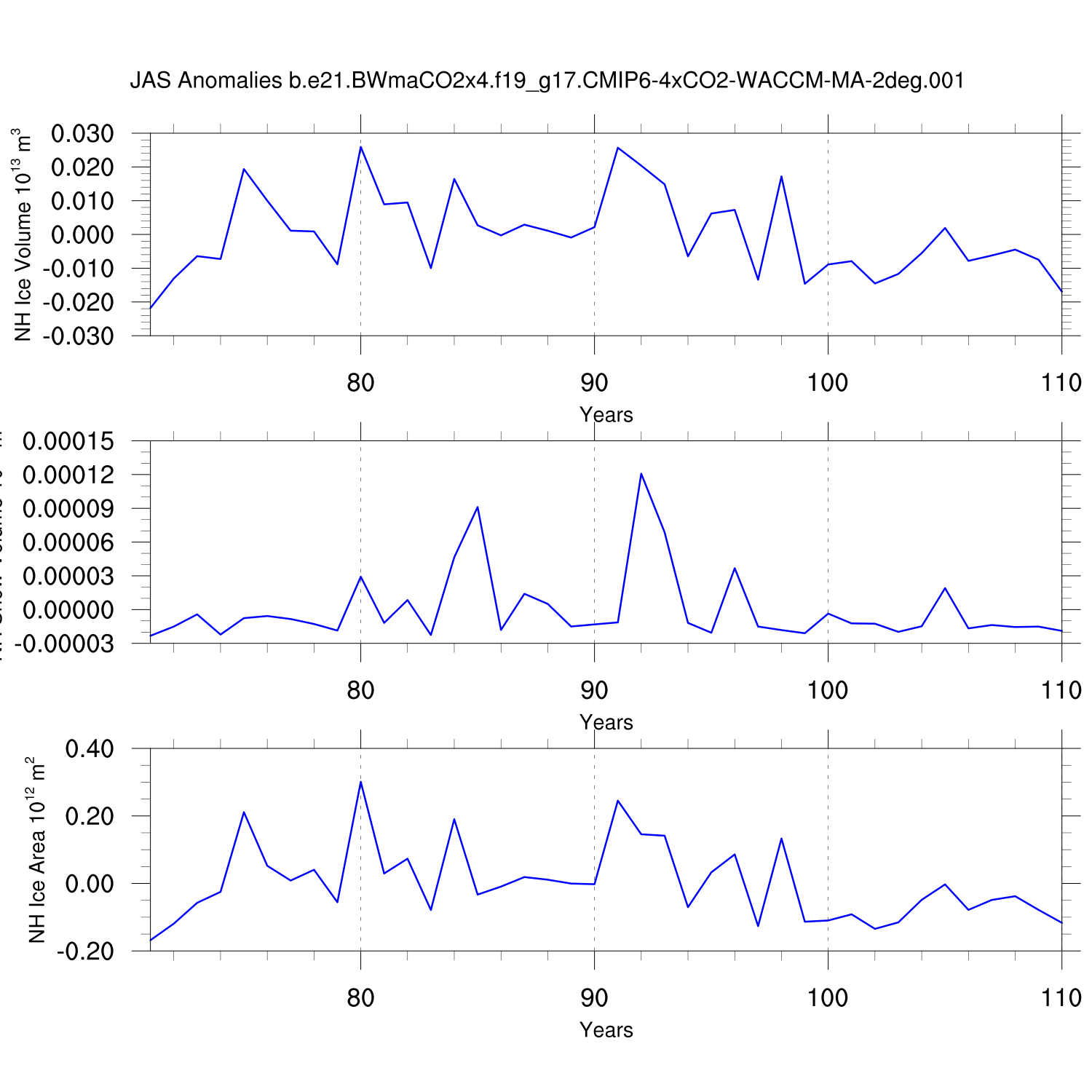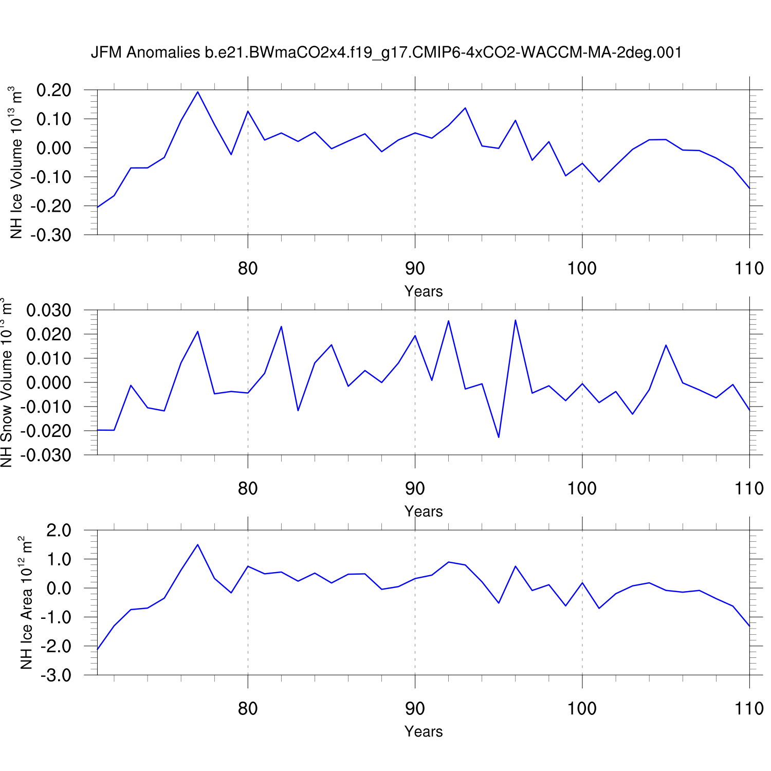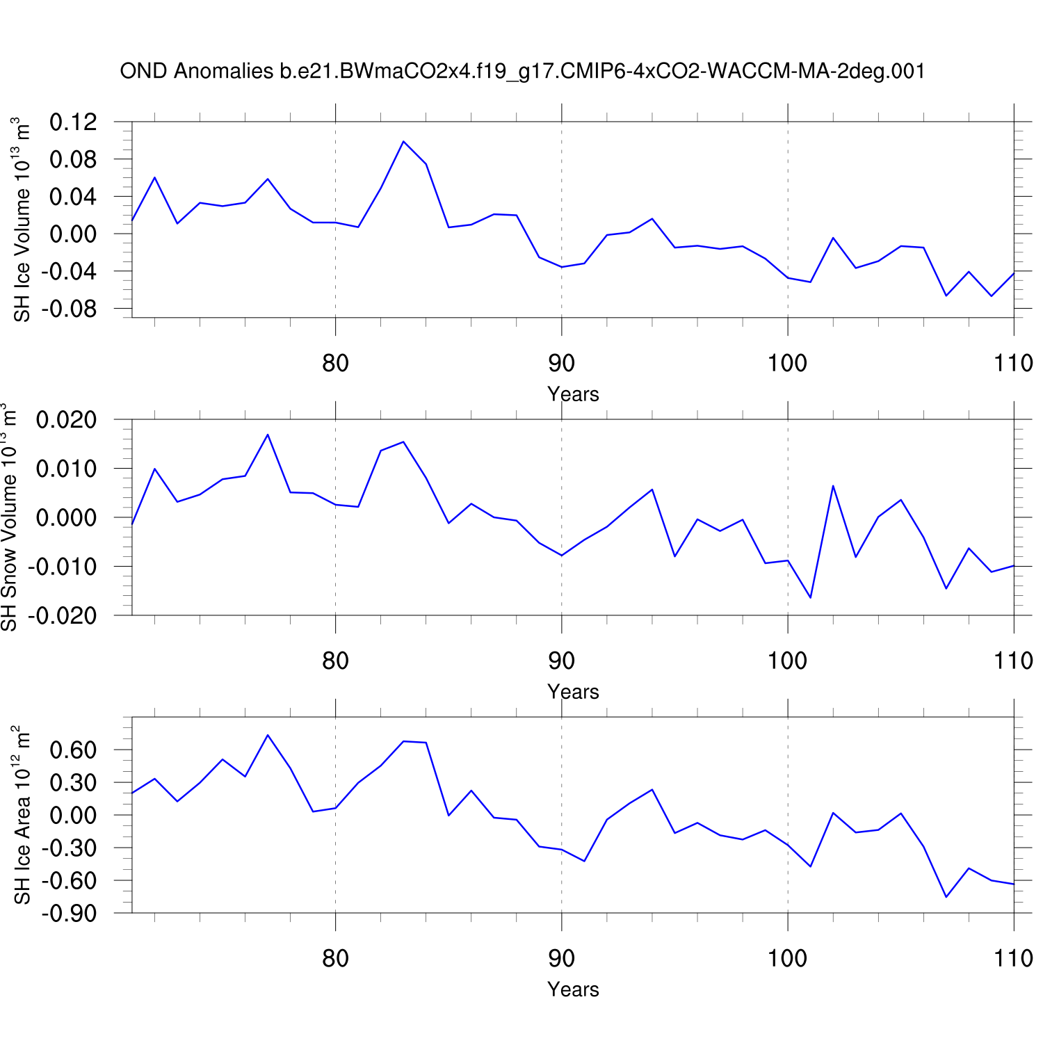 Time Series of Ice Volume, Snow Volume and Ice Area NH SH