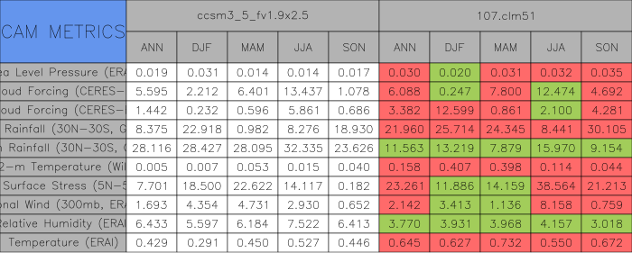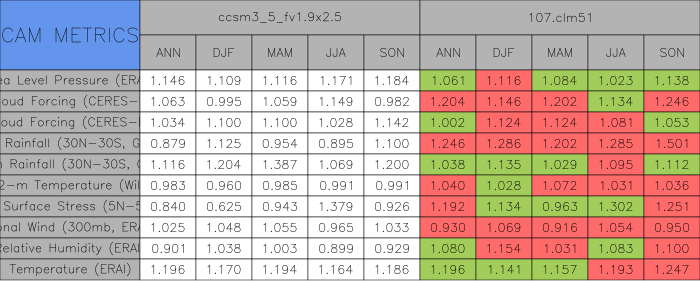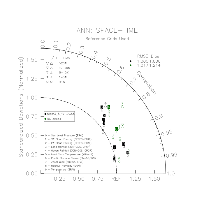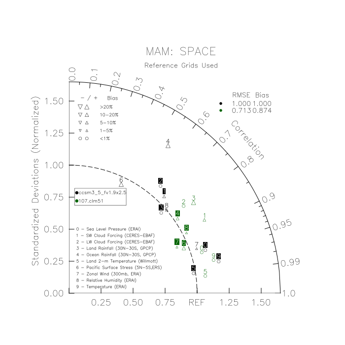 Taylor Diagrams were developed by Karl Taylor at PCMDI (paper|tech note) and aim to condense information about variance and RMSE characteristics of a particular model run when compared with observations in a single diagram. The tables summarize the individual metrics for each variable considered including: