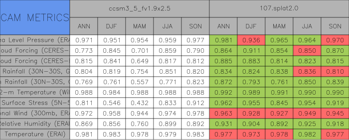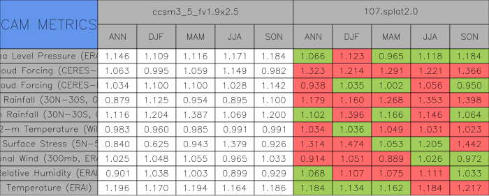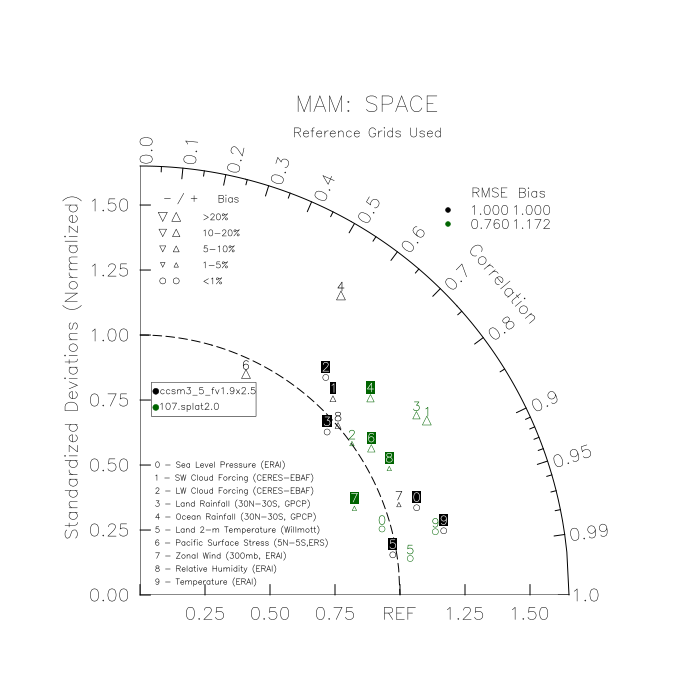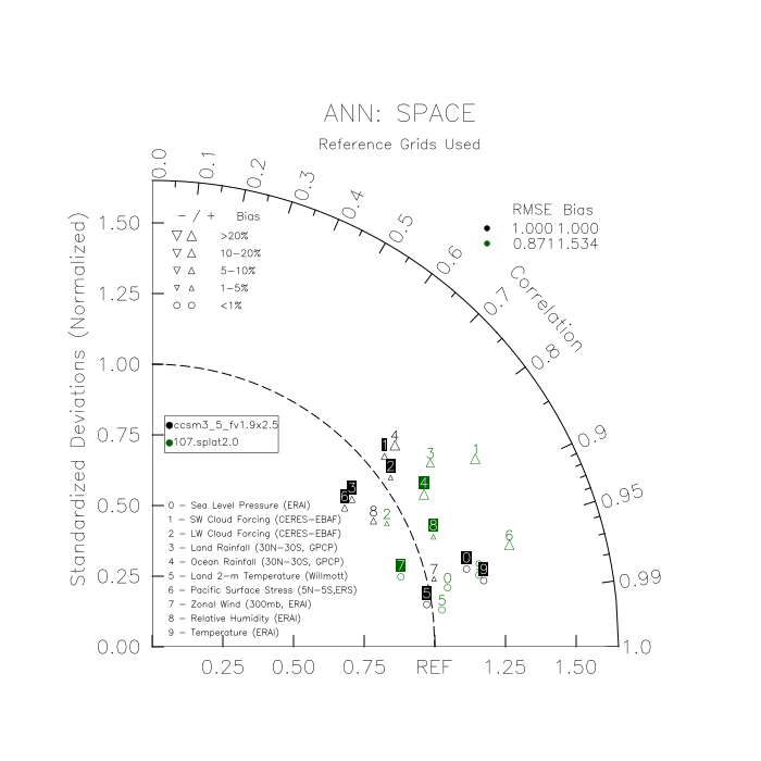 Taylor Diagrams were developed by Karl Taylor at PCMDI (paper|tech note) and aim to condense information about variance and RMSE characteristics of a particular model run when compared with observations in a single diagram. The tables summarize the individual metrics for each variable considered including: