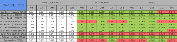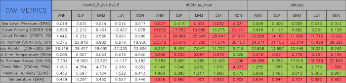 Taylor Diagrams were developed by Karl Taylor at PCMDI (paper|tech note) and aim to condense information about variance and RMSE characteristics of a particular model run when compared with observations in a single diagram. The tables summarize the individual metrics for each variable considered including: