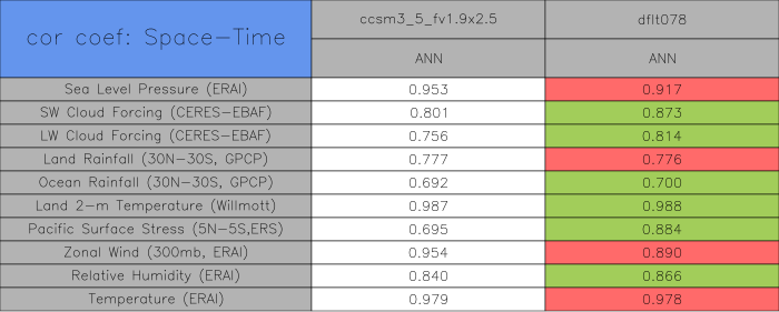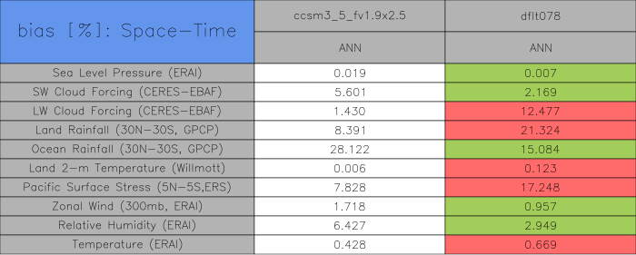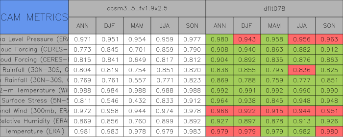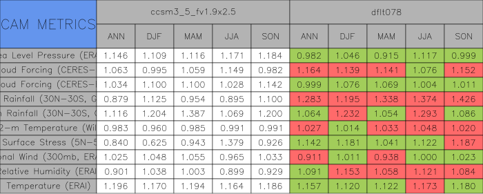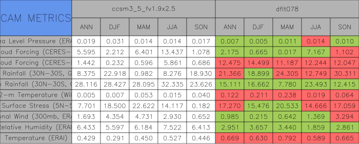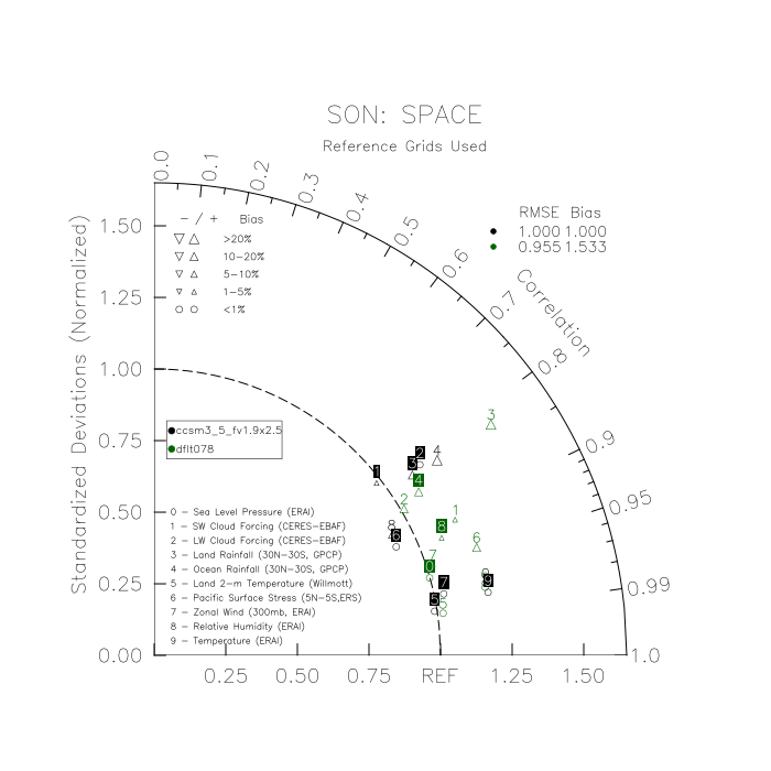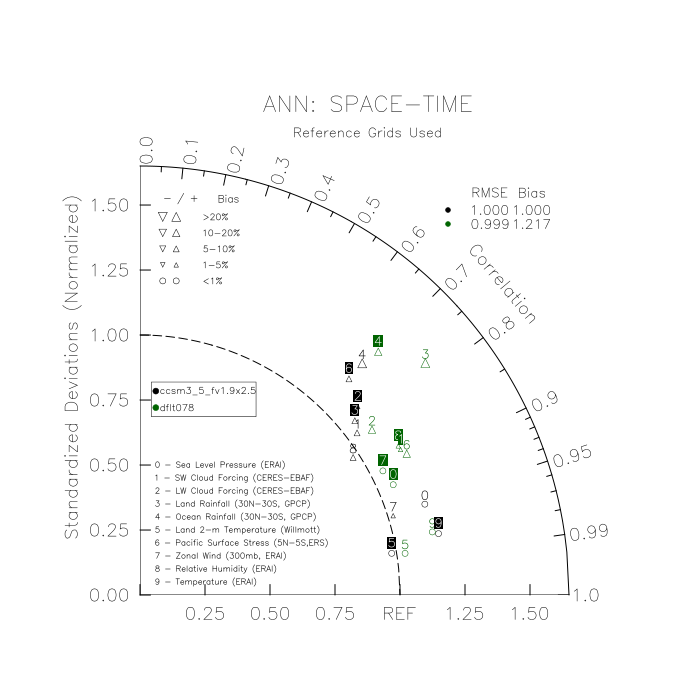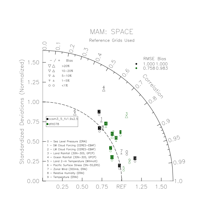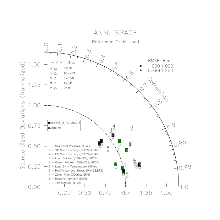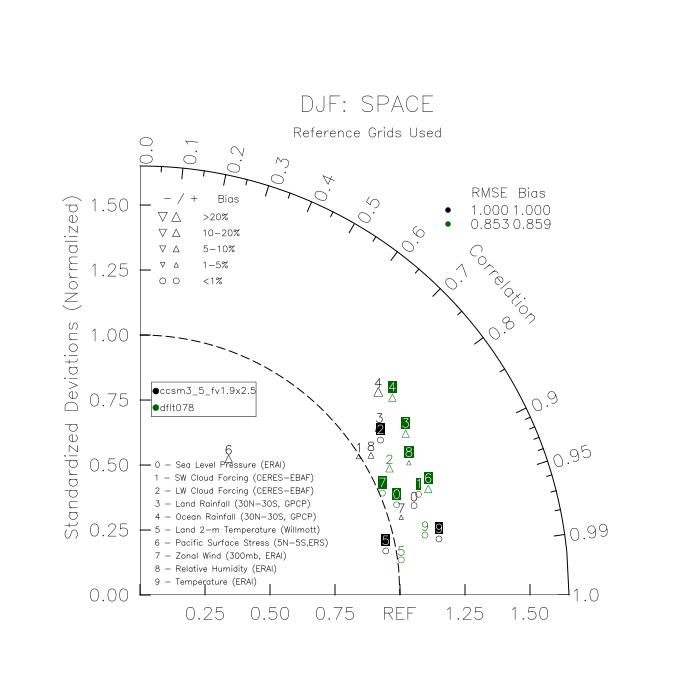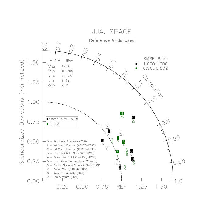 Taylor Diagrams were developed by Karl Taylor at PCMDI (paper|tech note) and aim to condense information about variance and RMSE characteristics of a particular model run when compared with observations in a single diagram. The tables summarize the individual metrics for each variable considered including: