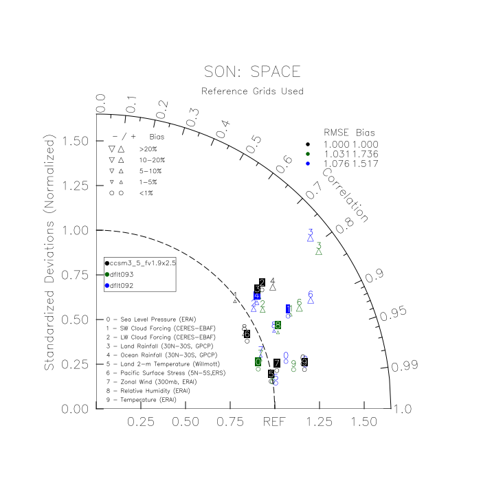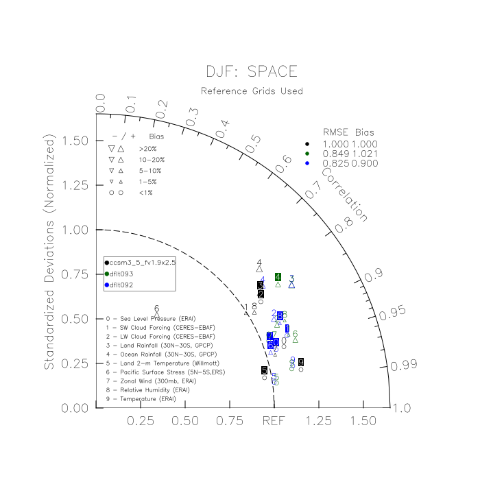 Taylor Diagrams were developed by Karl Taylor at PCMDI (paper|tech note) and aim to condense information about variance and RMSE characteristics of a particular model run when compared with observations in a single diagram. The tables summarize the individual metrics for each variable considered including: