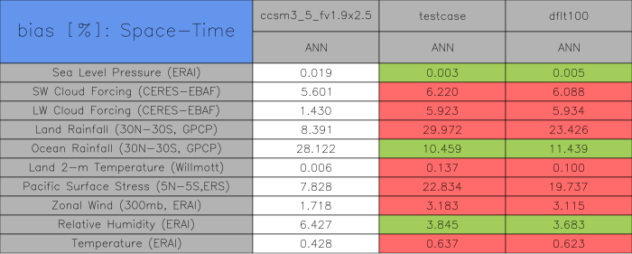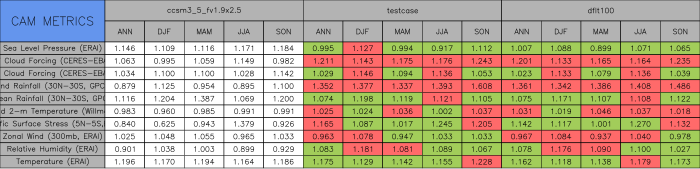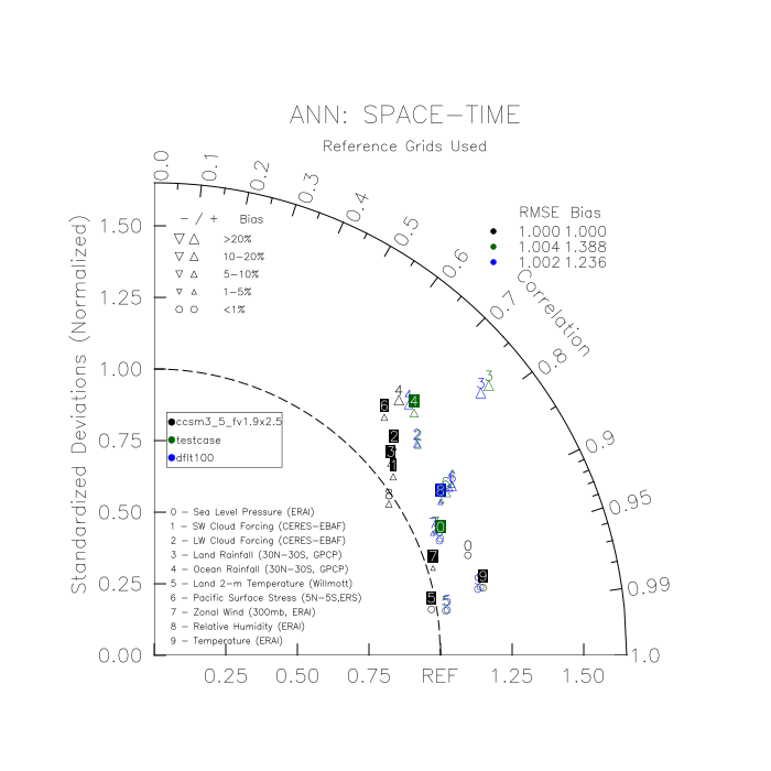 Taylor Diagrams were developed by Karl Taylor at PCMDI (paper|tech note) and aim to condense information about variance and RMSE characteristics of a particular model run when compared with observations in a single diagram. The tables summarize the individual metrics for each variable considered including: