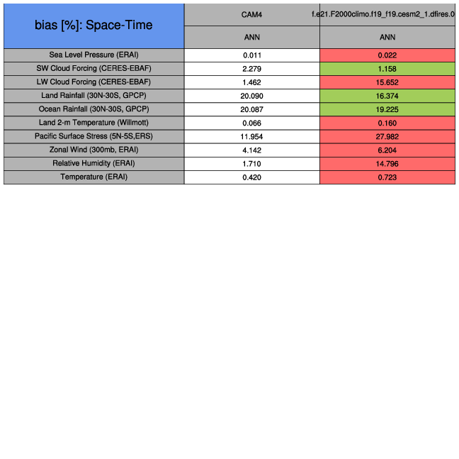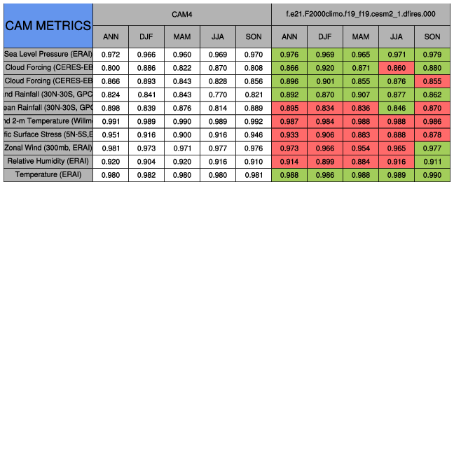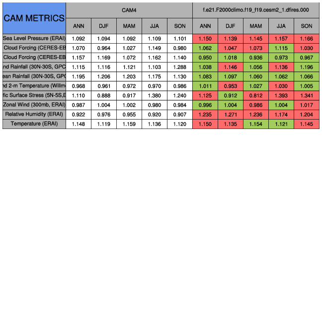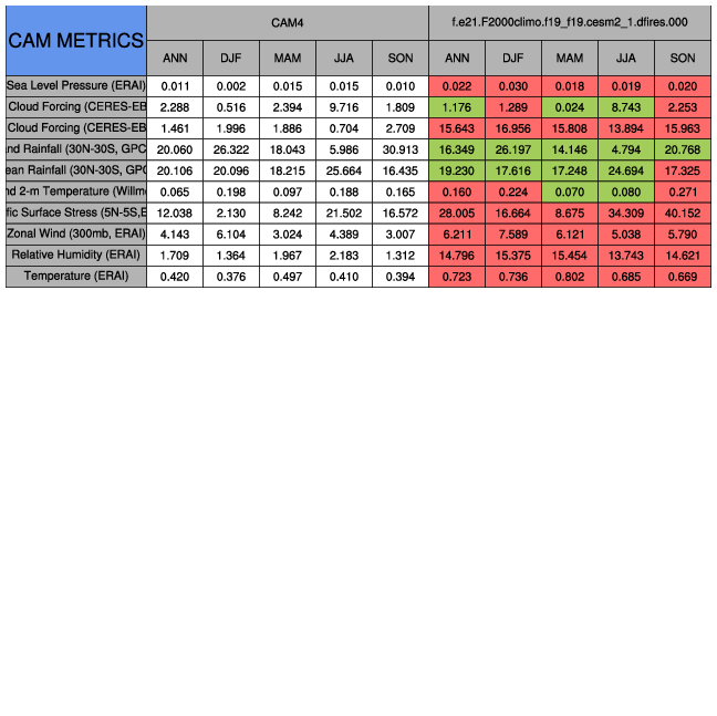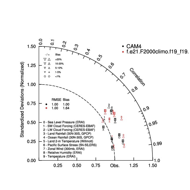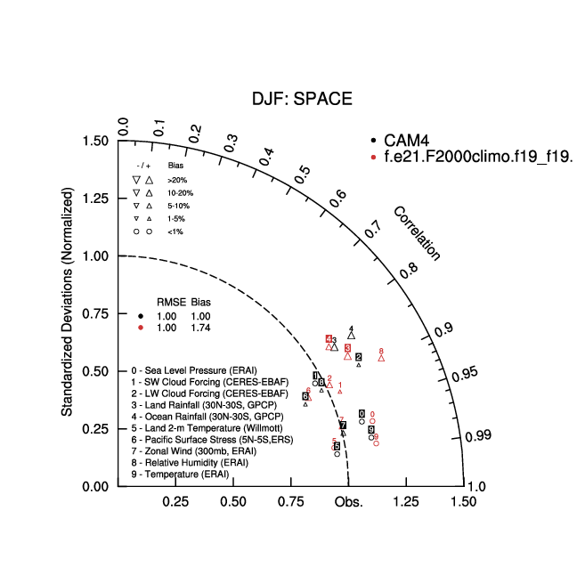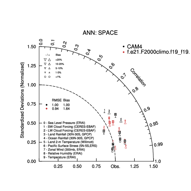 Taylor Diagrams were developed by Karl Taylor at PCMDI (paper|tech note) and aim to condense information about variance and RMSE characteristics of a particular model run when compared with observations in a single diagram. The tables summarize the individual metrics for each variable considered including: