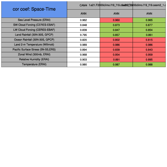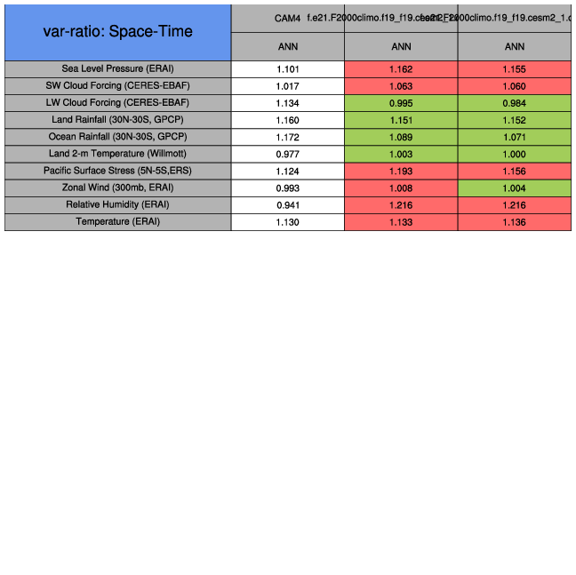 Taylor Diagrams were developed by Karl Taylor at PCMDI (paper|tech note) and aim to condense information about variance and RMSE characteristics of a particular model run when compared with observations in a single diagram. The tables summarize the individual metrics for each variable considered including: