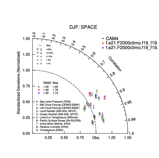 Taylor Diagrams were developed by Karl Taylor at PCMDI (paper|tech note) and aim to condense information about variance and RMSE characteristics of a particular model run when compared with observations in a single diagram. The tables summarize the individual metrics for each variable considered including: