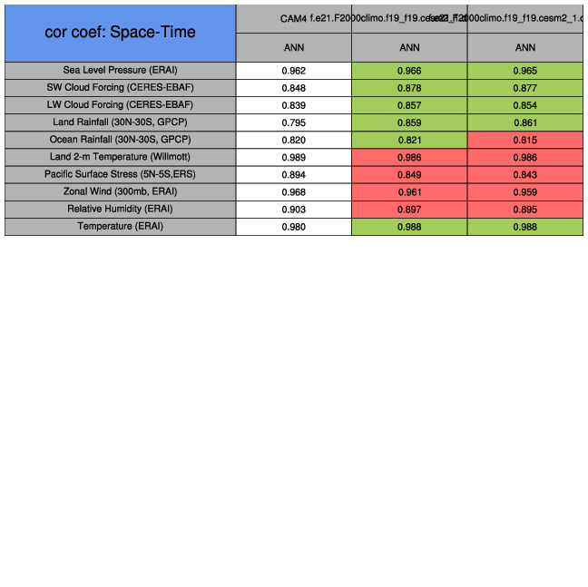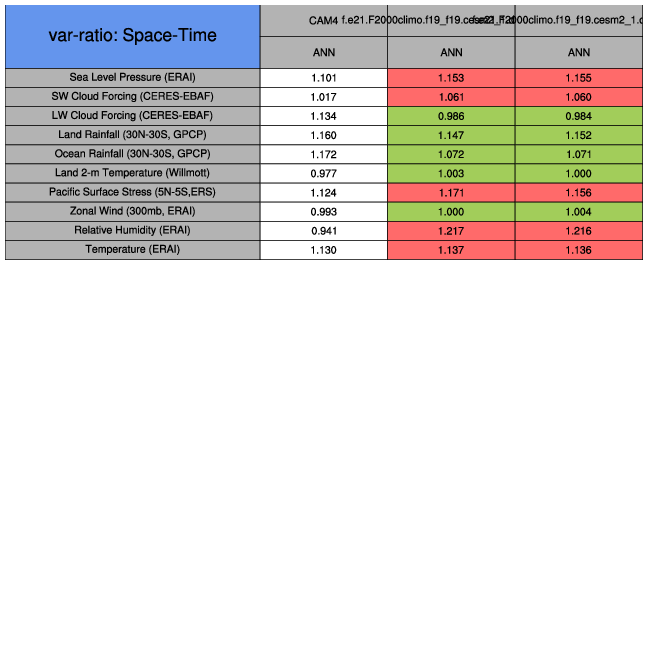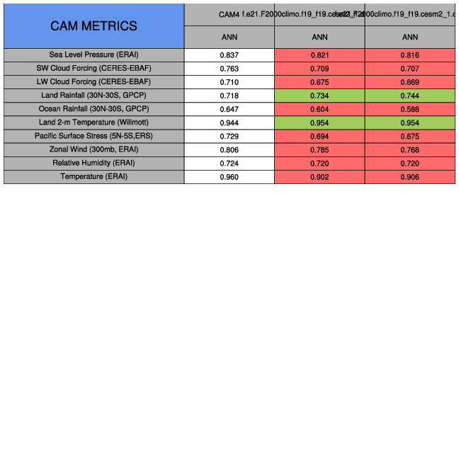 Taylor Diagrams were developed by Karl Taylor at PCMDI (paper|tech note) and aim to condense information about variance and RMSE characteristics of a particular model run when compared with observations in a single diagram. The tables summarize the individual metrics for each variable considered including: